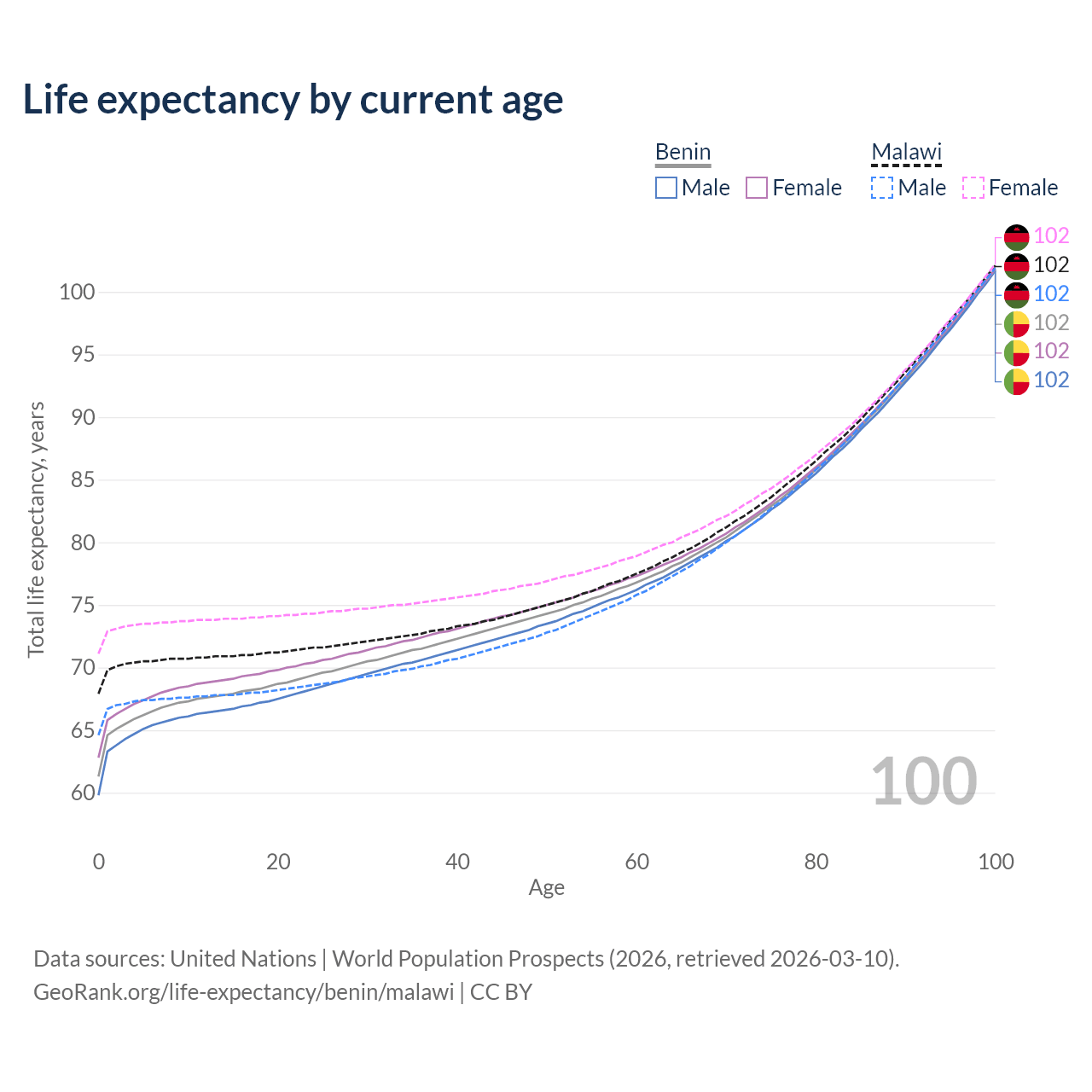 This life expectancy calculator shows the odds of living to 100, 95, 90, and below based on current age for both males and females in Benin and Malawi, along with mean and median age of death. The calculations are based on the 2026 life tables (actuarial tables) from the UN World Population Prospects.