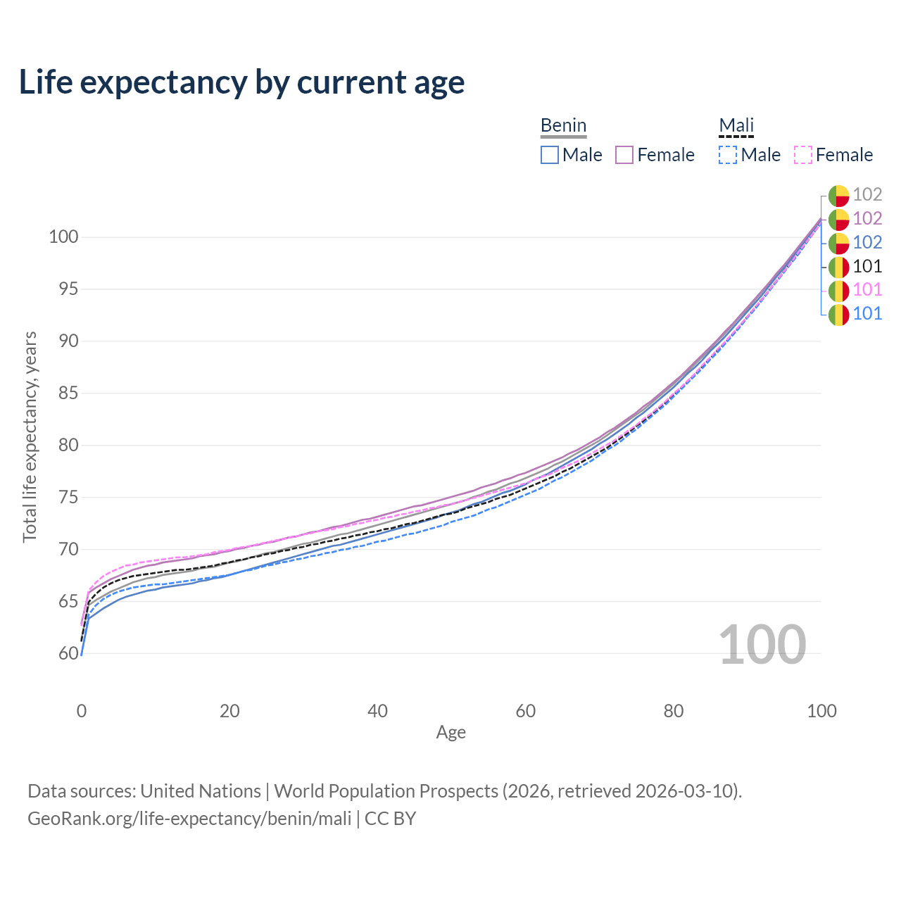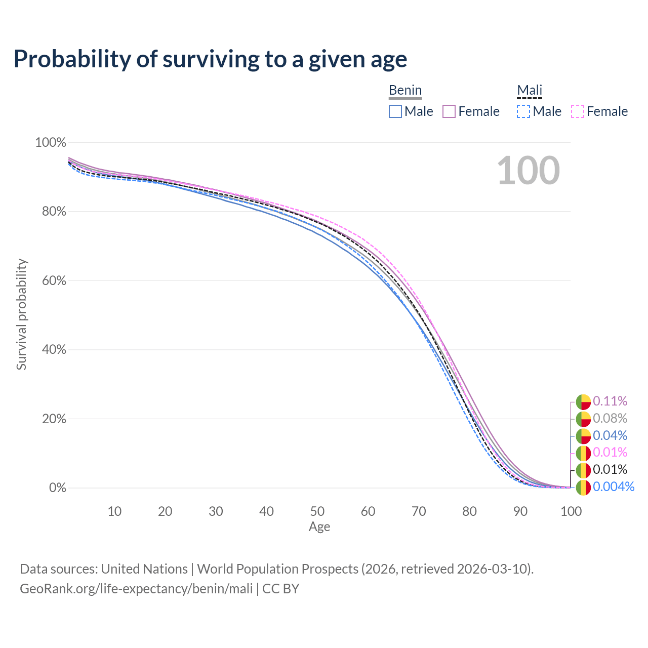 This life expectancy calculator shows the odds of living to 100, 95, 90, and below based on current age for both males and females in Benin and Mali, along with mean and median age of death. The calculations are based on the 2026 life tables (actuarial tables) from the UN World Population Prospects.