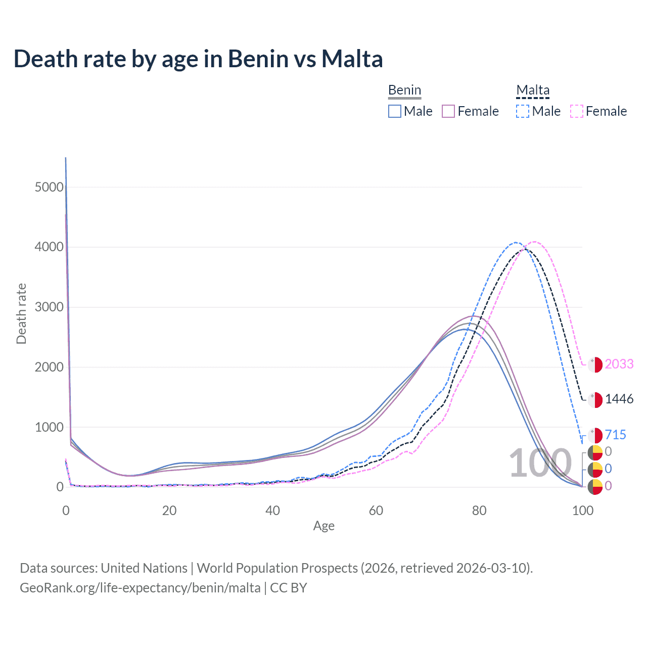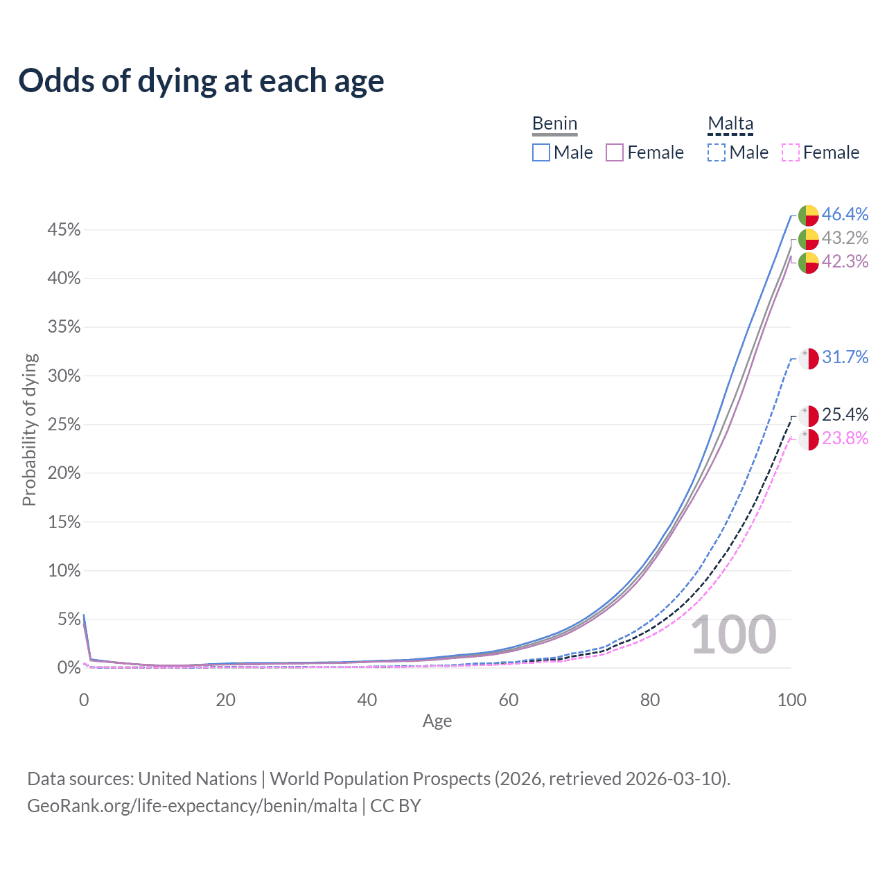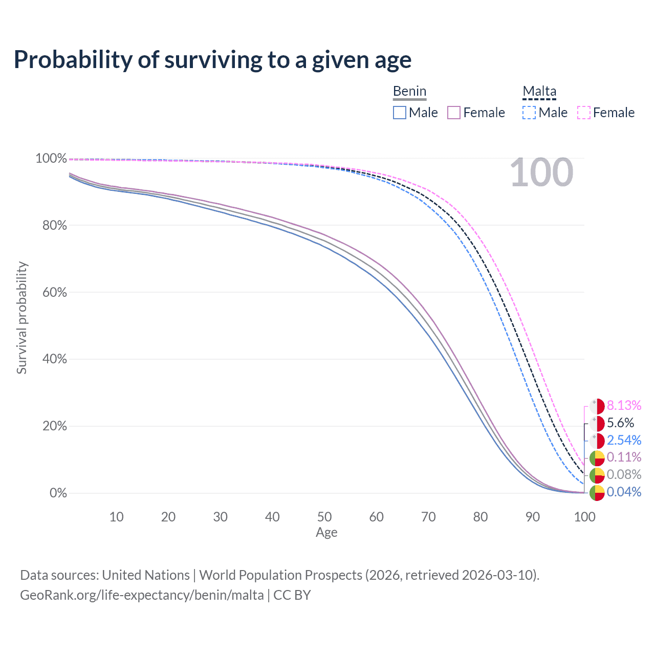 This life expectancy calculator shows the odds of living to 100, 95, 90, and below based on current age for both males and females in Benin and Malta, along with mean and median age of death. The calculations are based on the 2026 life tables (actuarial tables) from the UN World Population Prospects.