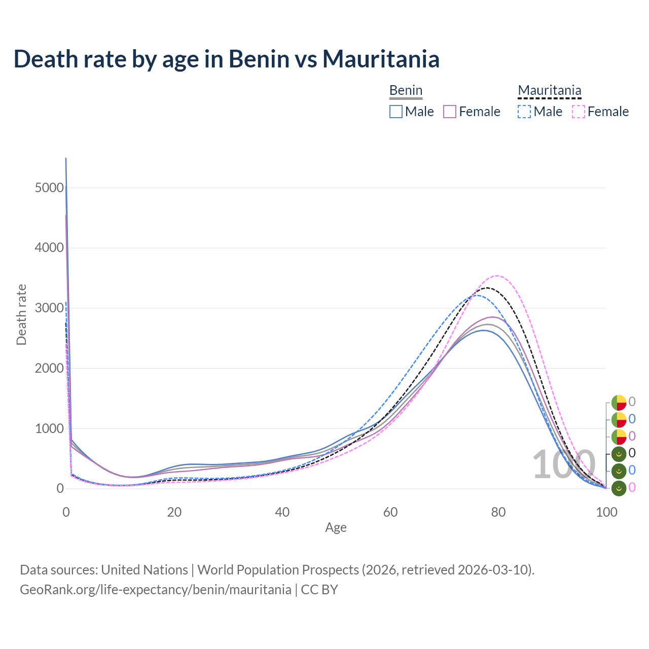In Benin, the most common age of death is 0, compared to 78 in Mauritania. The median age of death is 70.1 in Benin and 74.1 in Mauritania, meaning only half of each cohort is expected to live past that age.