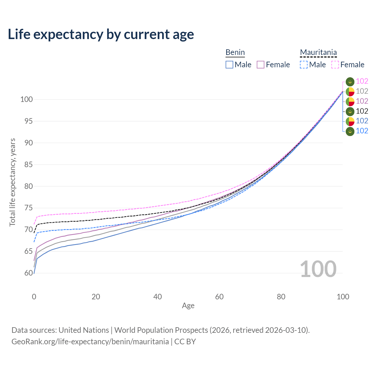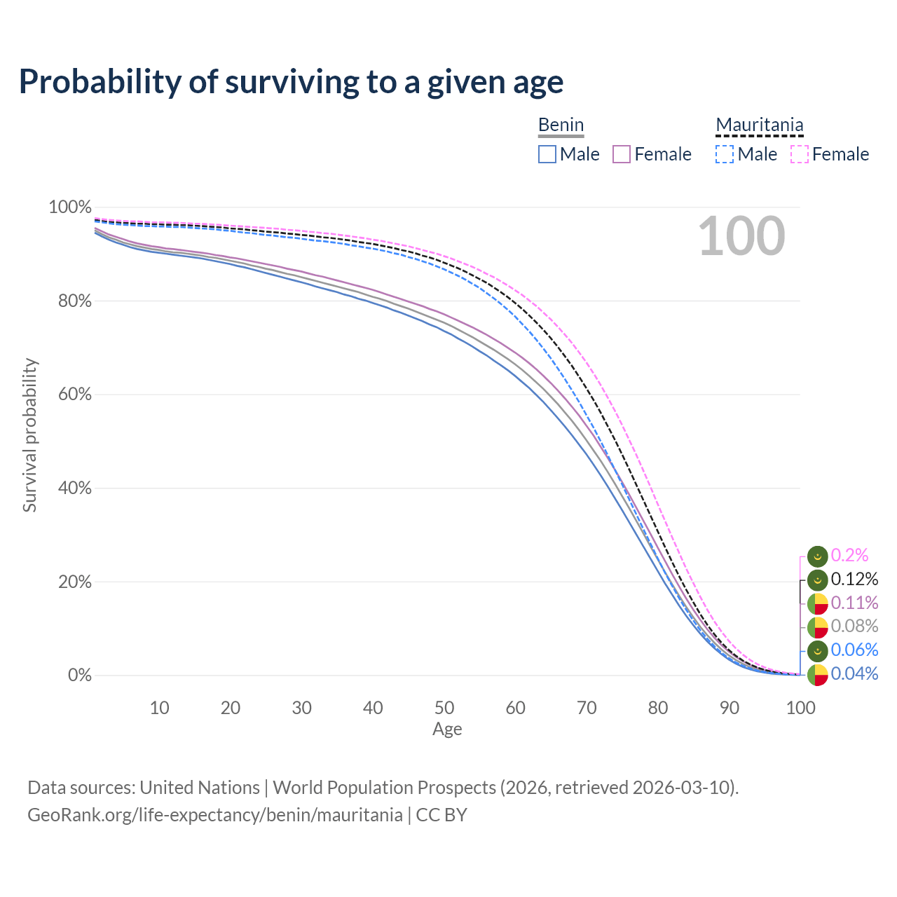 This life expectancy calculator shows the odds of living to 100, 95, 90, and below based on current age for both males and females in Benin and Mauritania, along with mean and median age of death. The calculations are based on the 2026 life tables (actuarial tables) from the UN World Population Prospects.