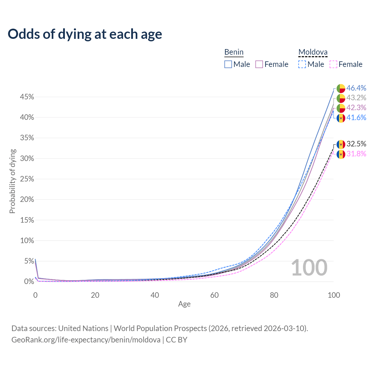 This life expectancy calculator shows the odds of living to 100, 95, 90, and below based on current age for both males and females in Benin and Moldova, along with mean and median age of death. The calculations are based on the 2026 life tables (actuarial tables) from the UN World Population Prospects.