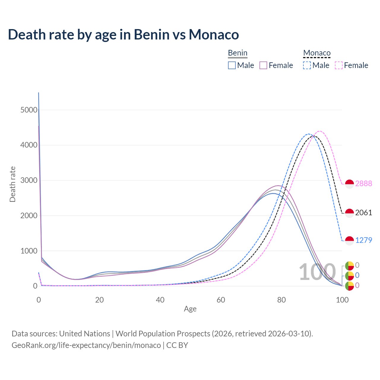 In Benin, the most common age of death is 0, compared to 91 in Monaco. The median age of death is 70.1 in Benin and 88.7 in Monaco, meaning only half of each cohort is expected to live past that age.