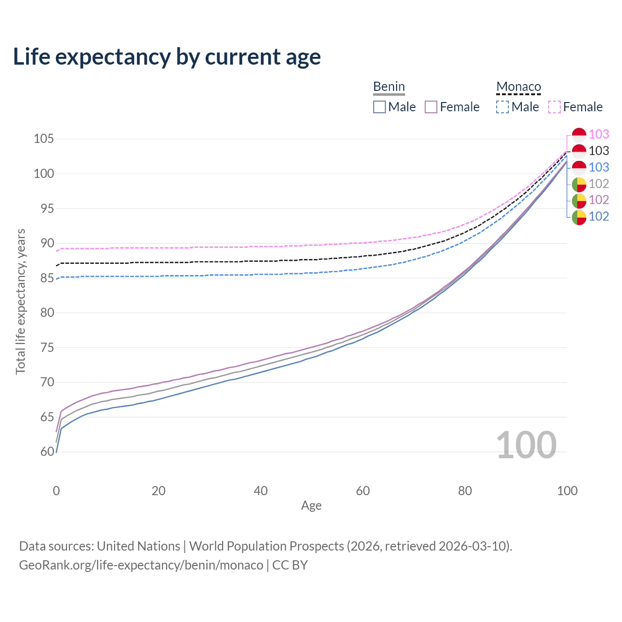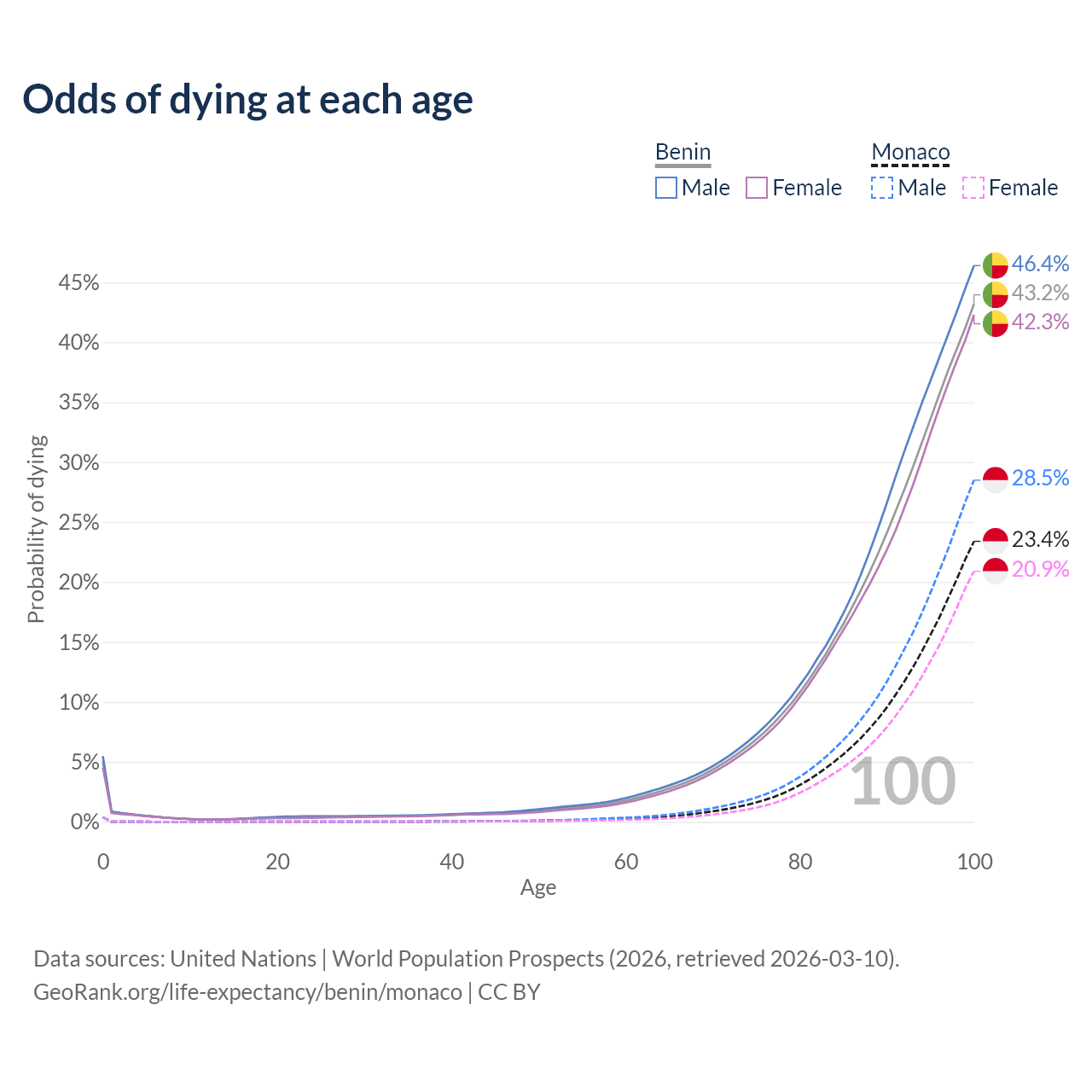 This life expectancy calculator shows the odds of living to 100, 95, 90, and below based on current age for both males and females in Benin and Monaco, along with mean and median age of death. The calculations are based on the 2026 life tables (actuarial tables) from the UN World Population Prospects.