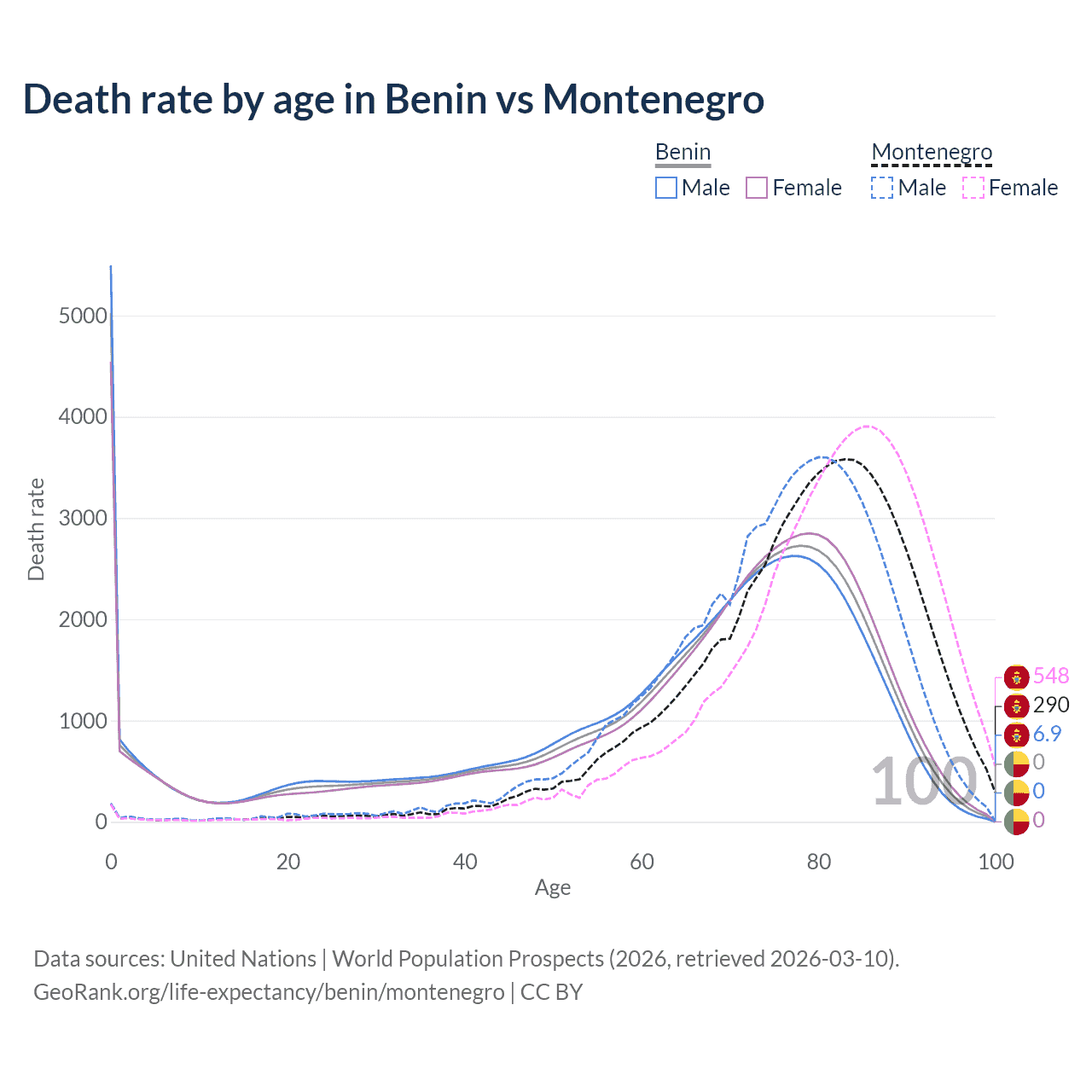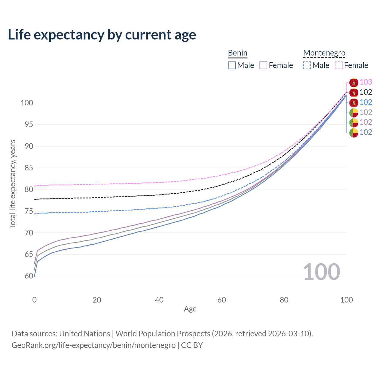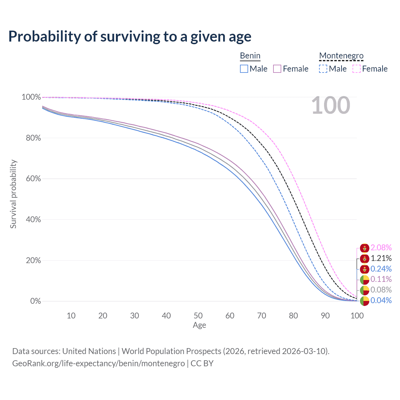 This life expectancy calculator shows the odds of living to 100, 95, 90, and below based on current age for both males and females in Benin and Montenegro, along with mean and median age of death. The calculations are based on the 2026 life tables (actuarial tables) from the UN World Population Prospects.