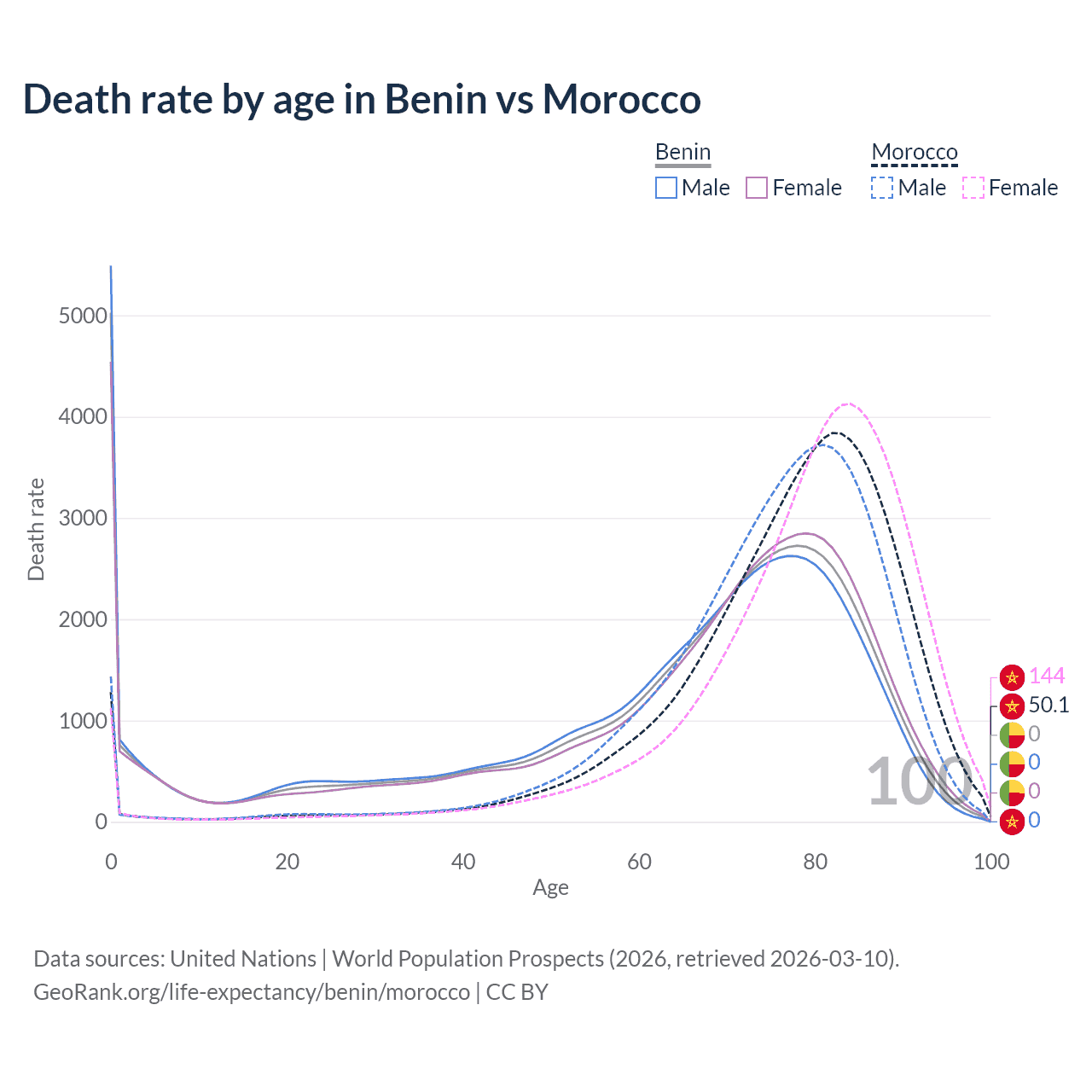 In Benin, the most common age of death is 0, compared to 82 in Morocco. The median age of death is 70.1 in Benin and 79.3 in Morocco, meaning only half of each cohort is expected to live past that age.