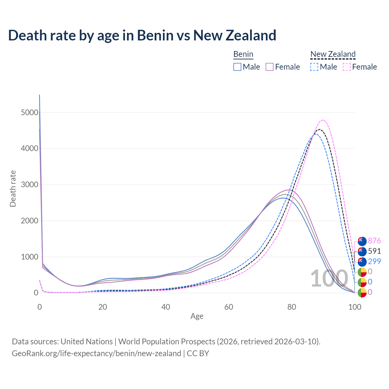 In Benin, the most common age of death is 0, compared to 89 in New Zealand. The median age of death is 70.1 in Benin and 85.8 in New Zealand, meaning only half of each cohort is expected to live past that age.