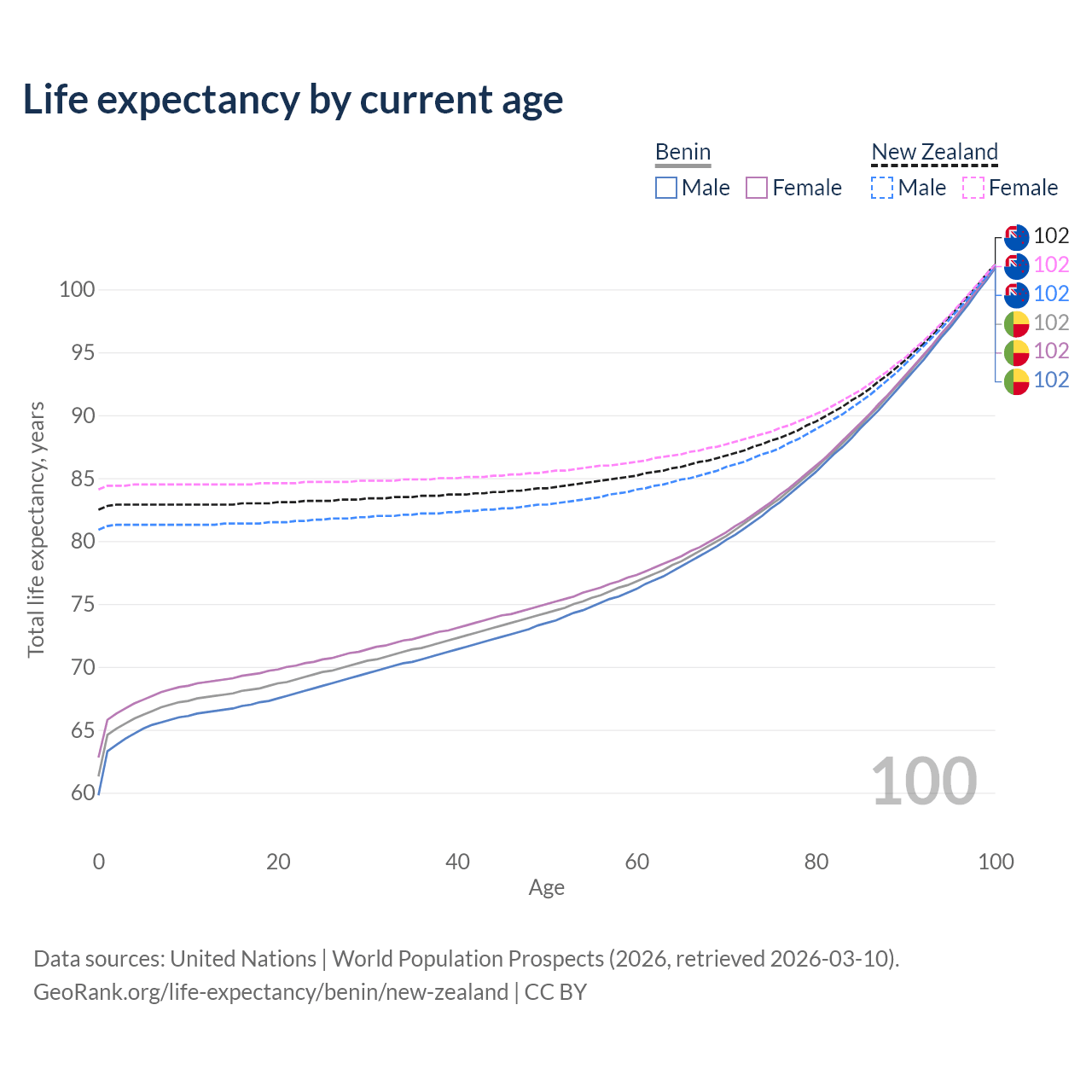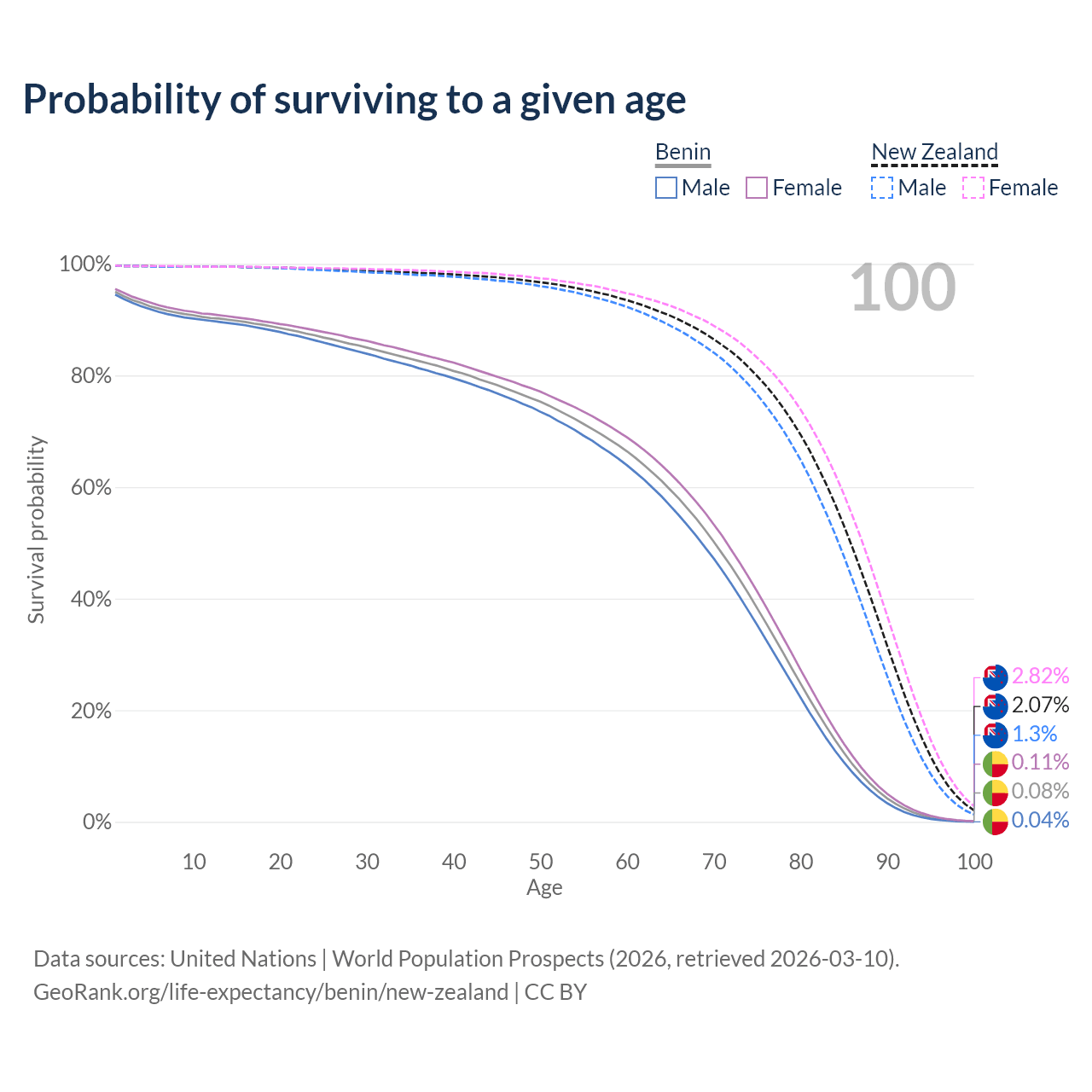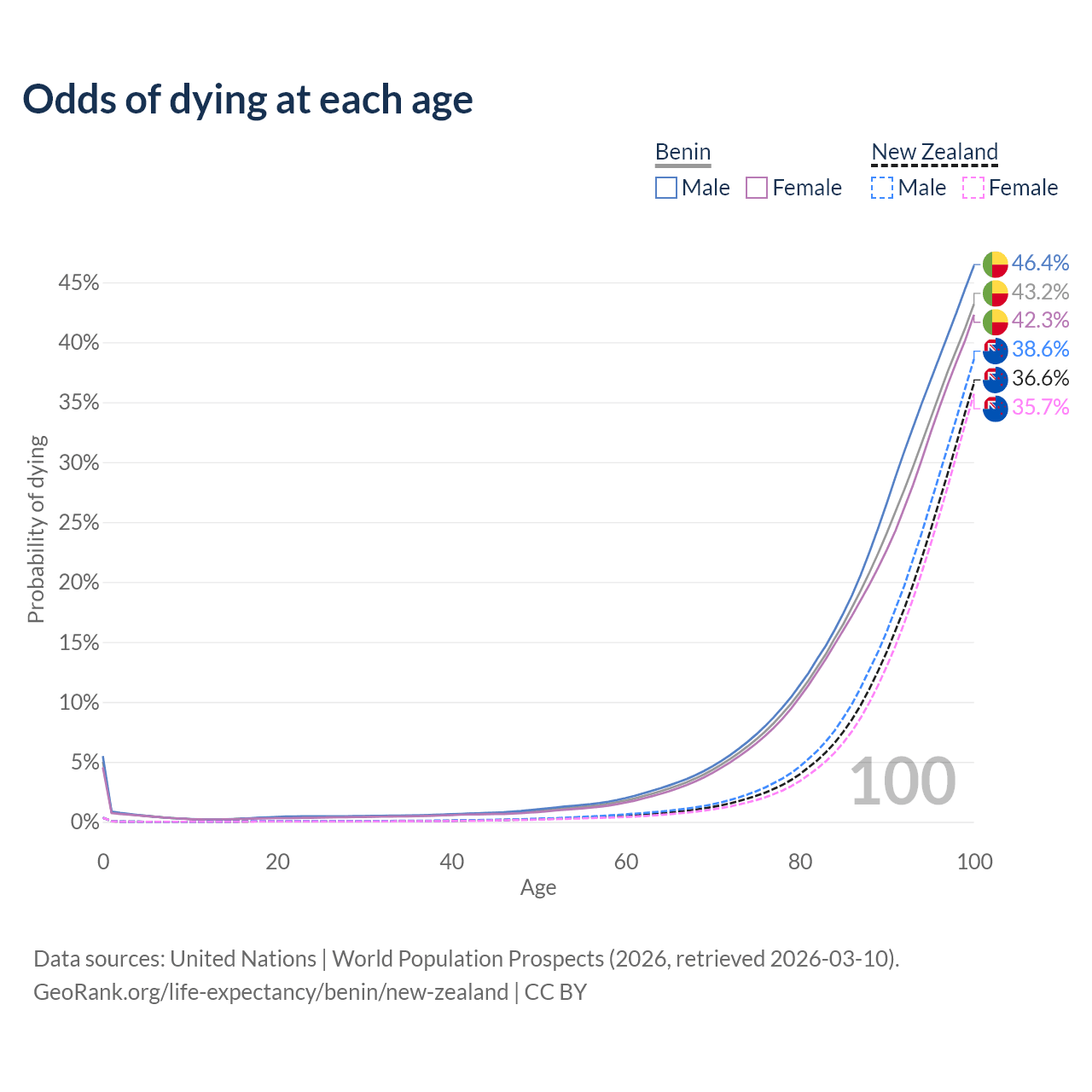 This life expectancy calculator shows the odds of living to 100, 95, 90, and below based on current age for both males and females in Benin and New Zealand, along with mean and median age of death. The calculations are based on the 2026 life tables (actuarial tables) from the UN World Population Prospects.