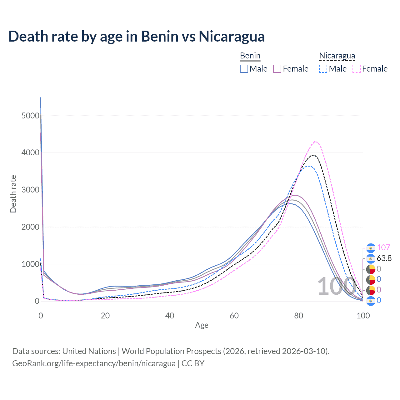 In Benin, the most common age of death is 0, compared to 85 in Nicaragua. The median age of death is 70.1 in Benin and 79.9 in Nicaragua, meaning only half of each cohort is expected to live past that age.