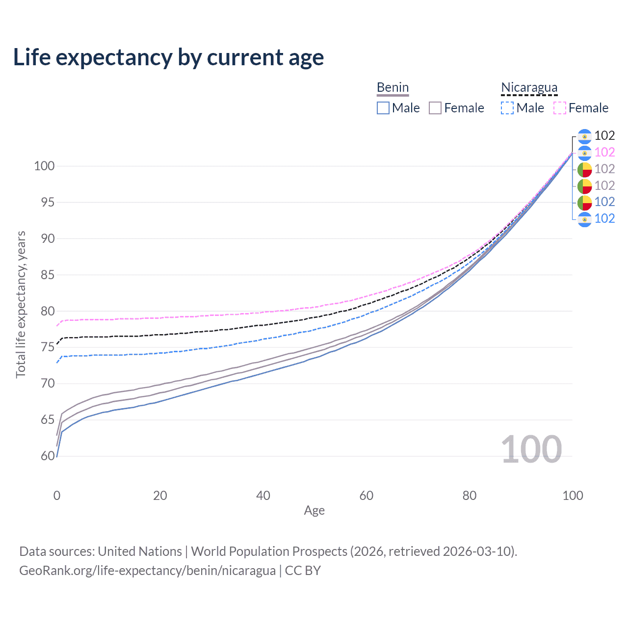 This life expectancy calculator shows the odds of living to 100, 95, 90, and below based on current age for both males and females in Benin and Nicaragua, along with mean and median age of death. The calculations are based on the 2026 life tables (actuarial tables) from the UN World Population Prospects.