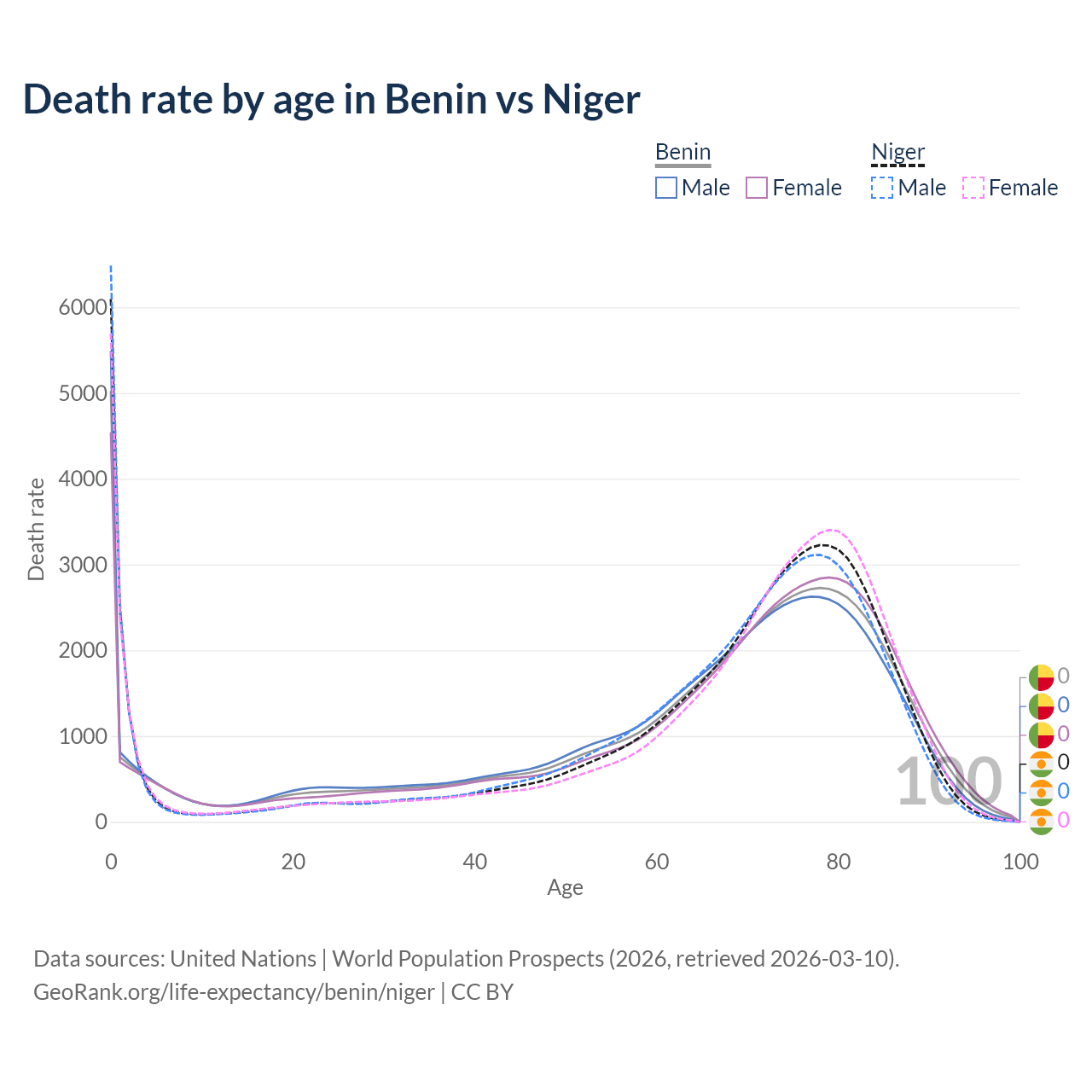 In Benin, the most common age of death is 0, compared to 0 in Niger. The median age of death is 70.1 in Benin and 71.7 in Niger, meaning only half of each cohort is expected to live past that age.