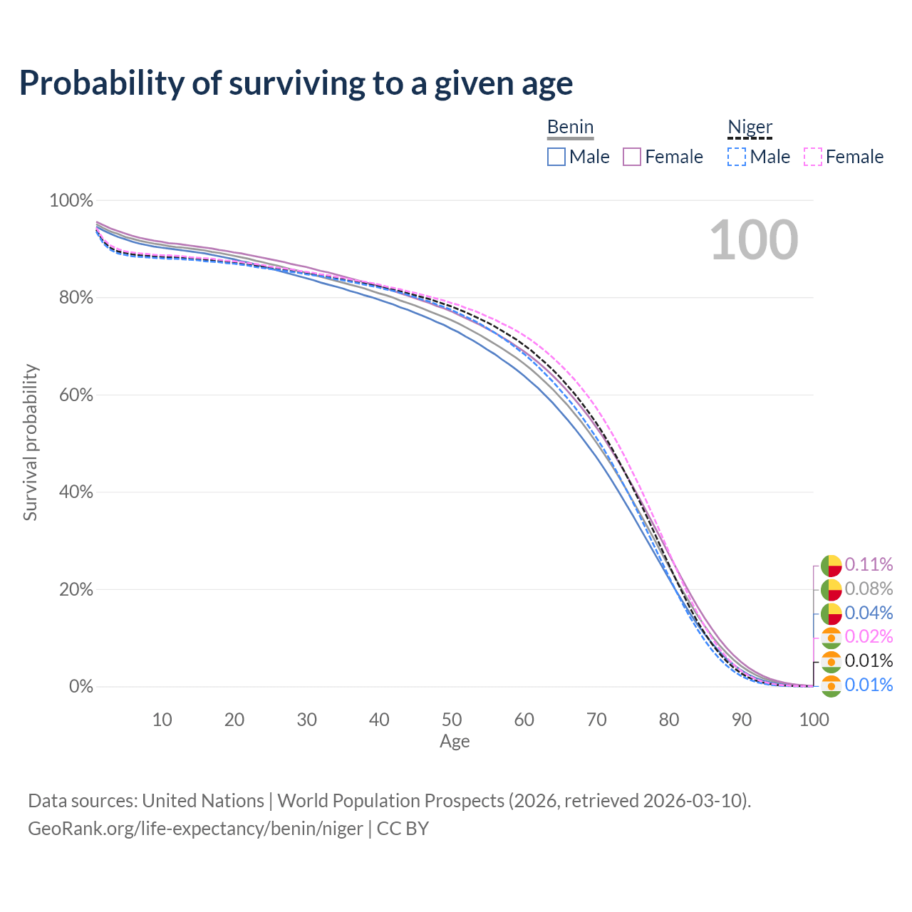 This life expectancy calculator shows the odds of living to 100, 95, 90, and below based on current age for both males and females in Benin and Niger, along with mean and median age of death. The calculations are based on the 2026 life tables (actuarial tables) from the UN World Population Prospects.