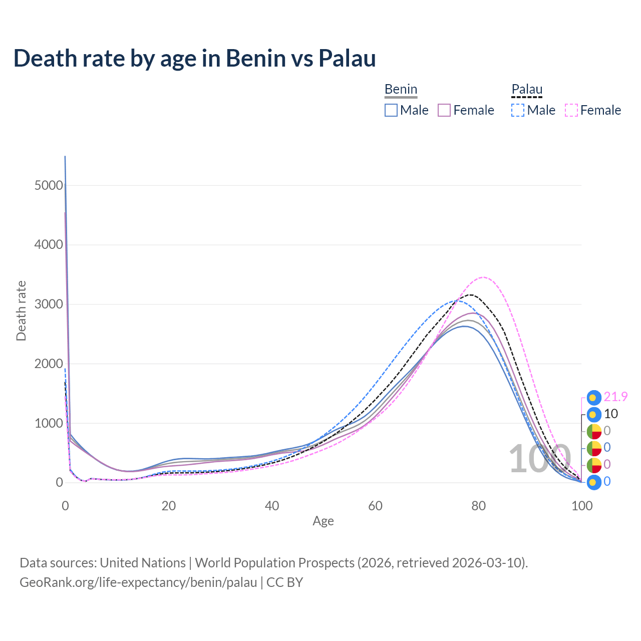 In Benin, the most common age of death is 0, compared to 78 in Palau. The median age of death is 70.1 in Benin and 73.8 in Palau, meaning only half of each cohort is expected to live past that age.