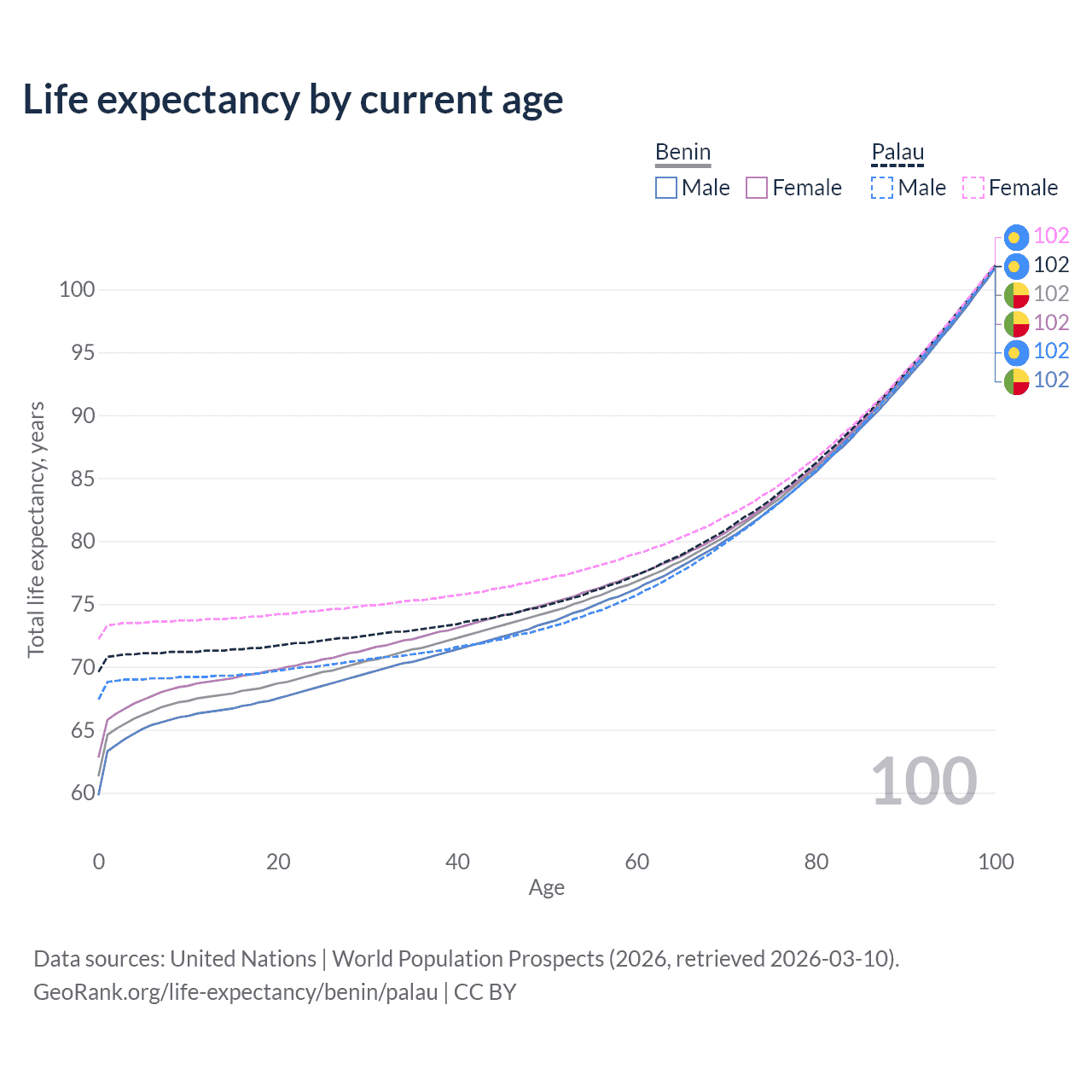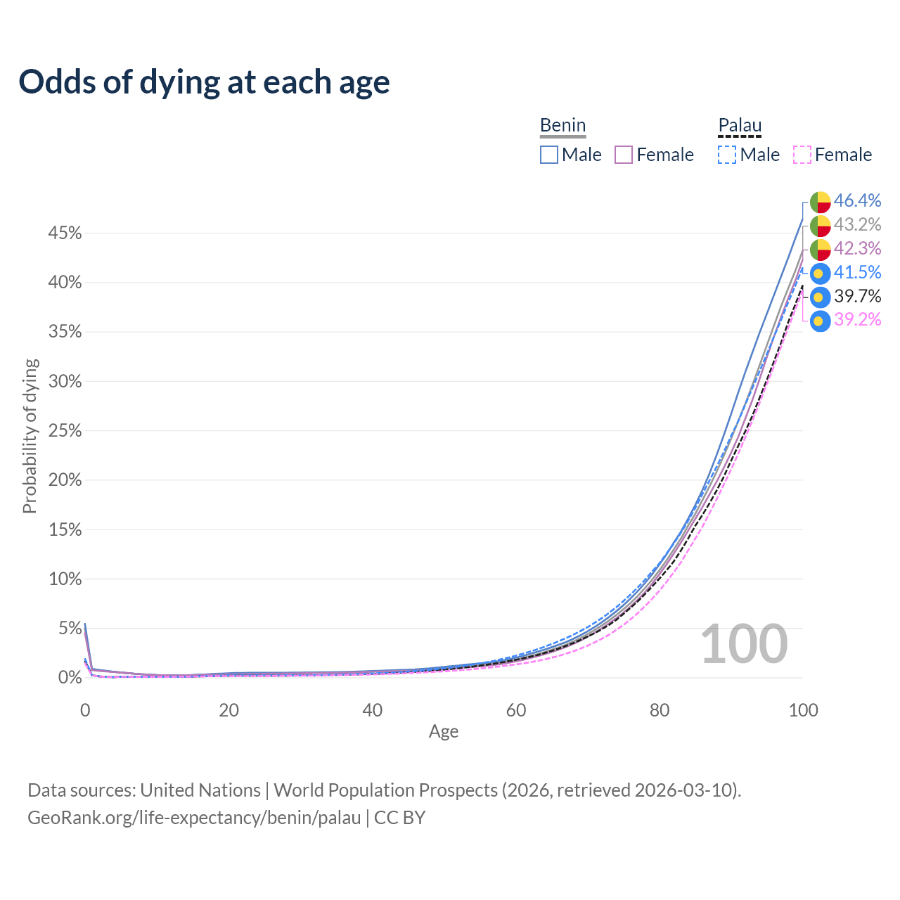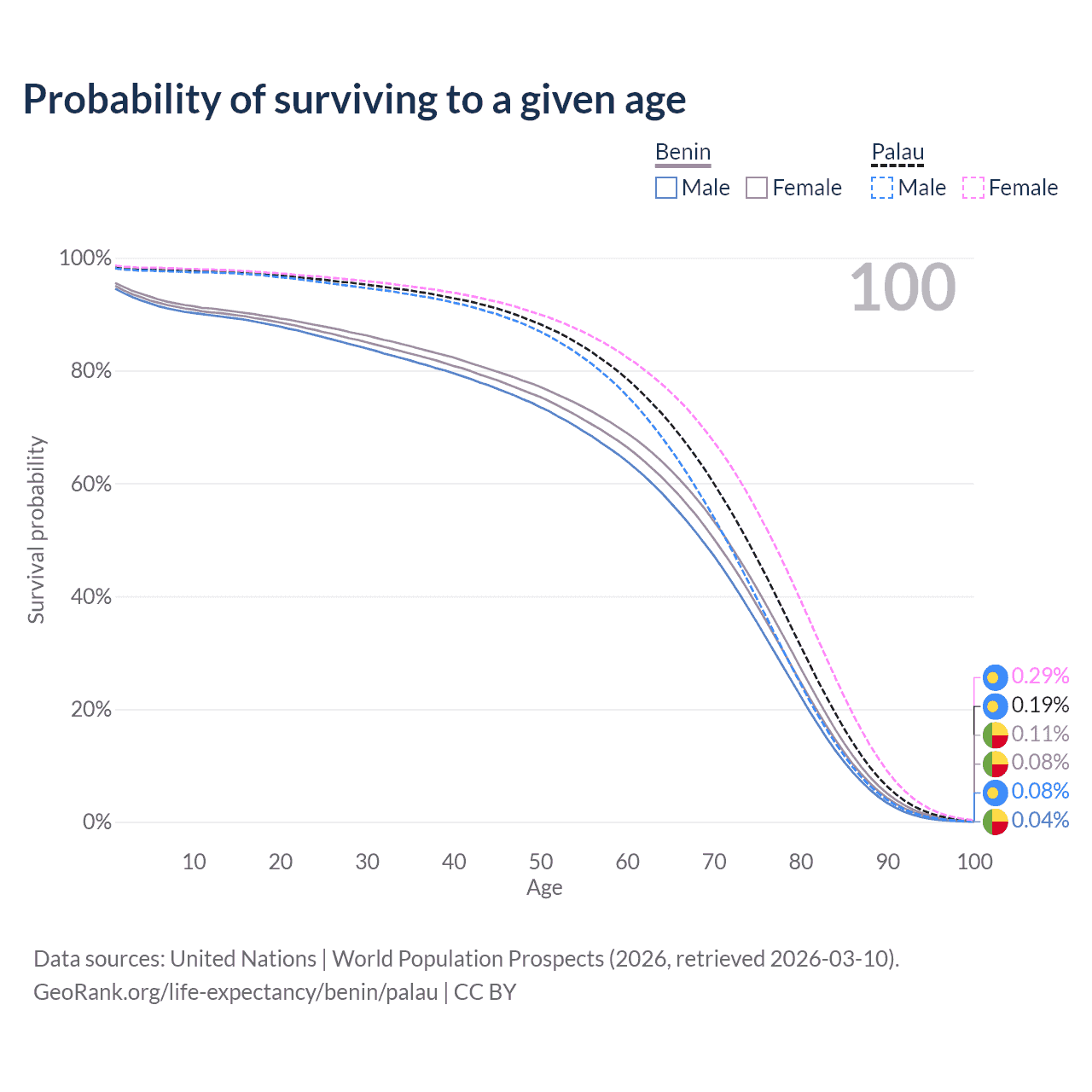 This life expectancy calculator shows the odds of living to 100, 95, 90, and below based on current age for both males and females in Benin and Palau, along with mean and median age of death. The calculations are based on the 2026 life tables (actuarial tables) from the UN World Population Prospects.