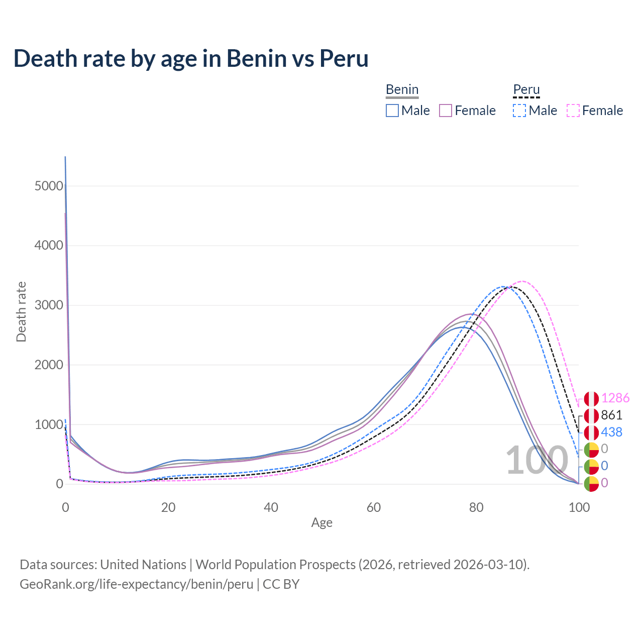 Note that this chart does not show rates per 100,000 population, as those would be skewed by age structure differences and reflect the demographics of Benin and Peru more than their death rates.