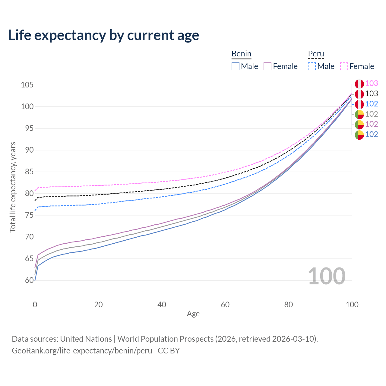 This life expectancy calculator shows the odds of living to 100, 95, 90, and below based on current age for both males and females in Benin and Peru, along with mean and median age of death. The calculations are based on the 2026 life tables (actuarial tables) from the UN World Population Prospects.