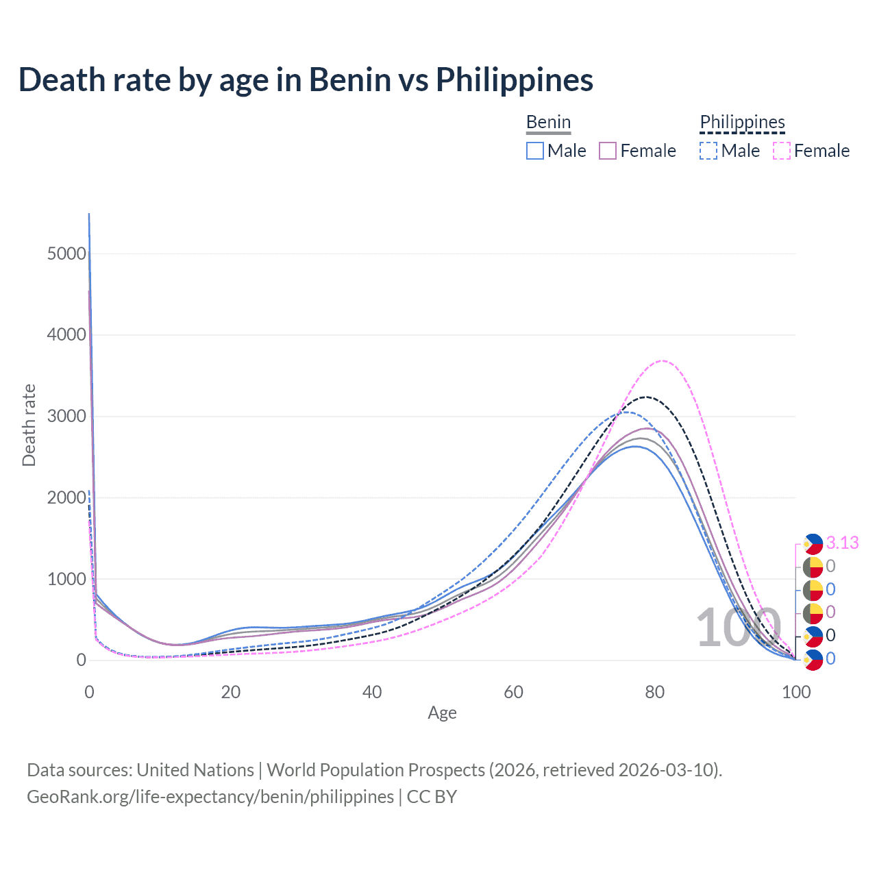 In Benin, the most common age of death is 0, compared to 79 in the Philippines. The median age of death is 70.1 in Benin and 74.6 in the Philippines, meaning only half of each cohort is expected to live past that age.
