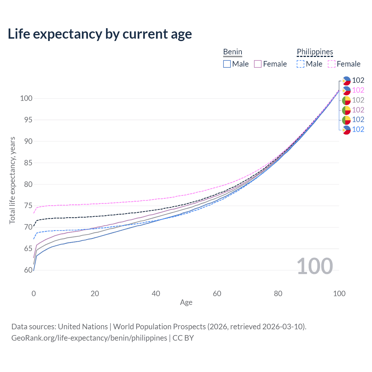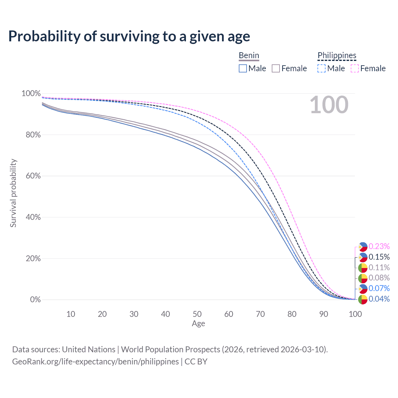 This life expectancy calculator shows the odds of living to 100, 95, 90, and below based on current age for both males and females in Benin and the Philippines, along with mean and median age of death. The calculations are based on the 2026 life tables (actuarial tables) from the UN World Population Prospects.