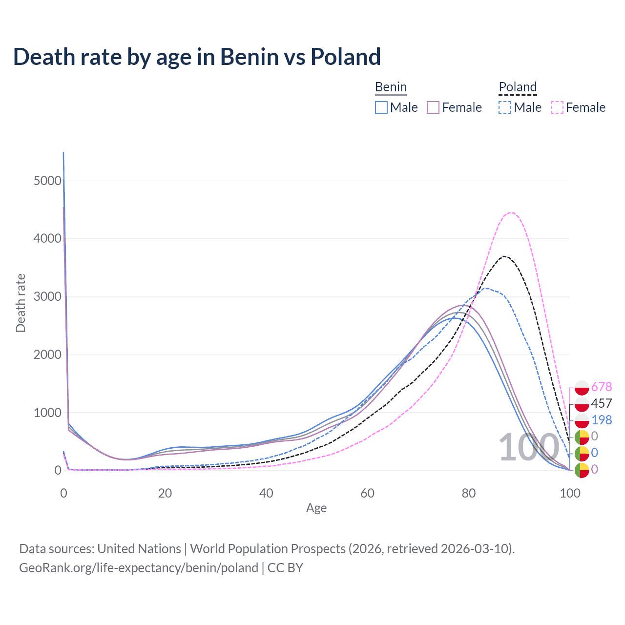 This life expectancy calculator shows the odds of living to 100, 95, 90, and below based on current age for both males and females in Benin and Poland, along with mean and median age of death. The calculations are based on the 2026 life tables (actuarial tables) from the UN World Population Prospects.