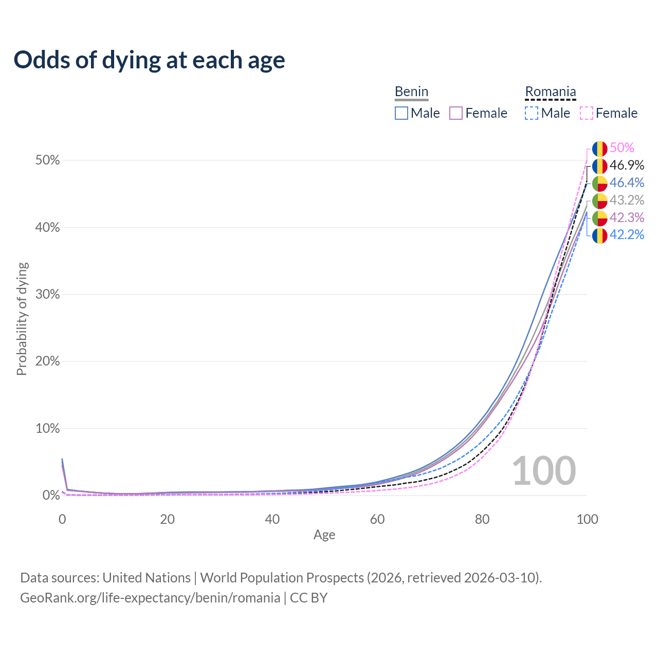 This life expectancy calculator shows the odds of living to 100, 95, 90, and below based on current age for both males and females in Benin and Romania, along with mean and median age of death. The calculations are based on the 2026 life tables (actuarial tables) from the UN World Population Prospects.