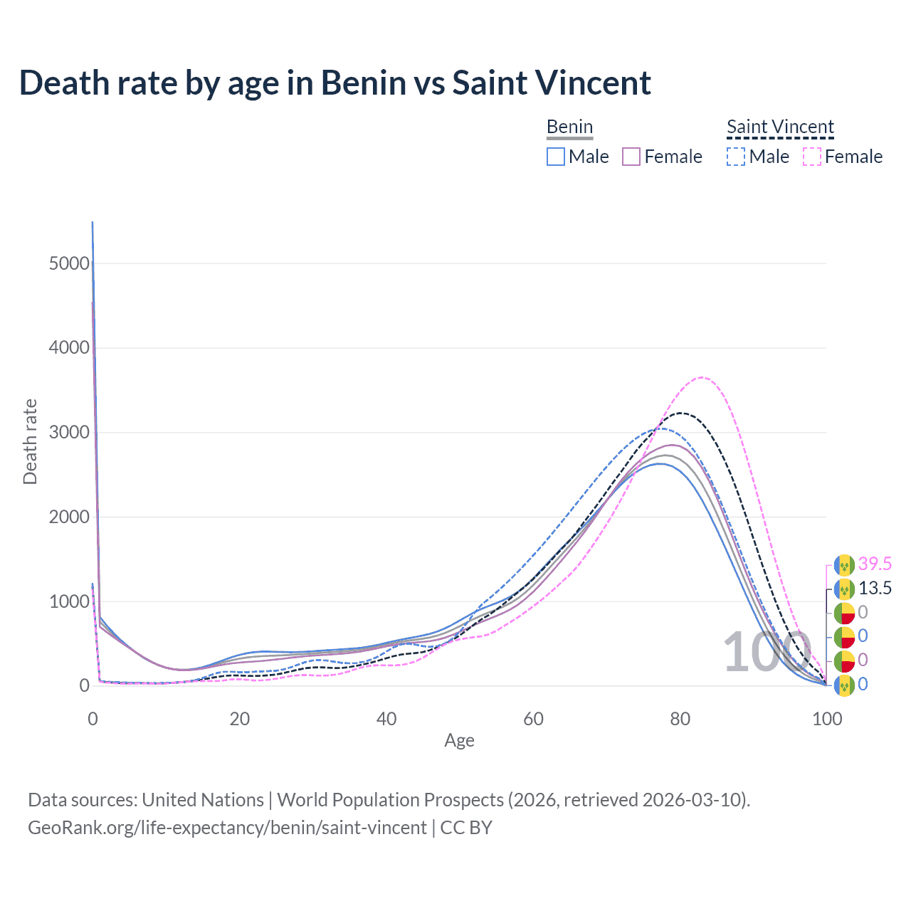 In Benin, the most common age of death is 0, compared to 80 in Saint Vincent. The median age of death is 70.1 in Benin and 75.6 in Saint Vincent, meaning only half of each cohort is expected to live past that age.