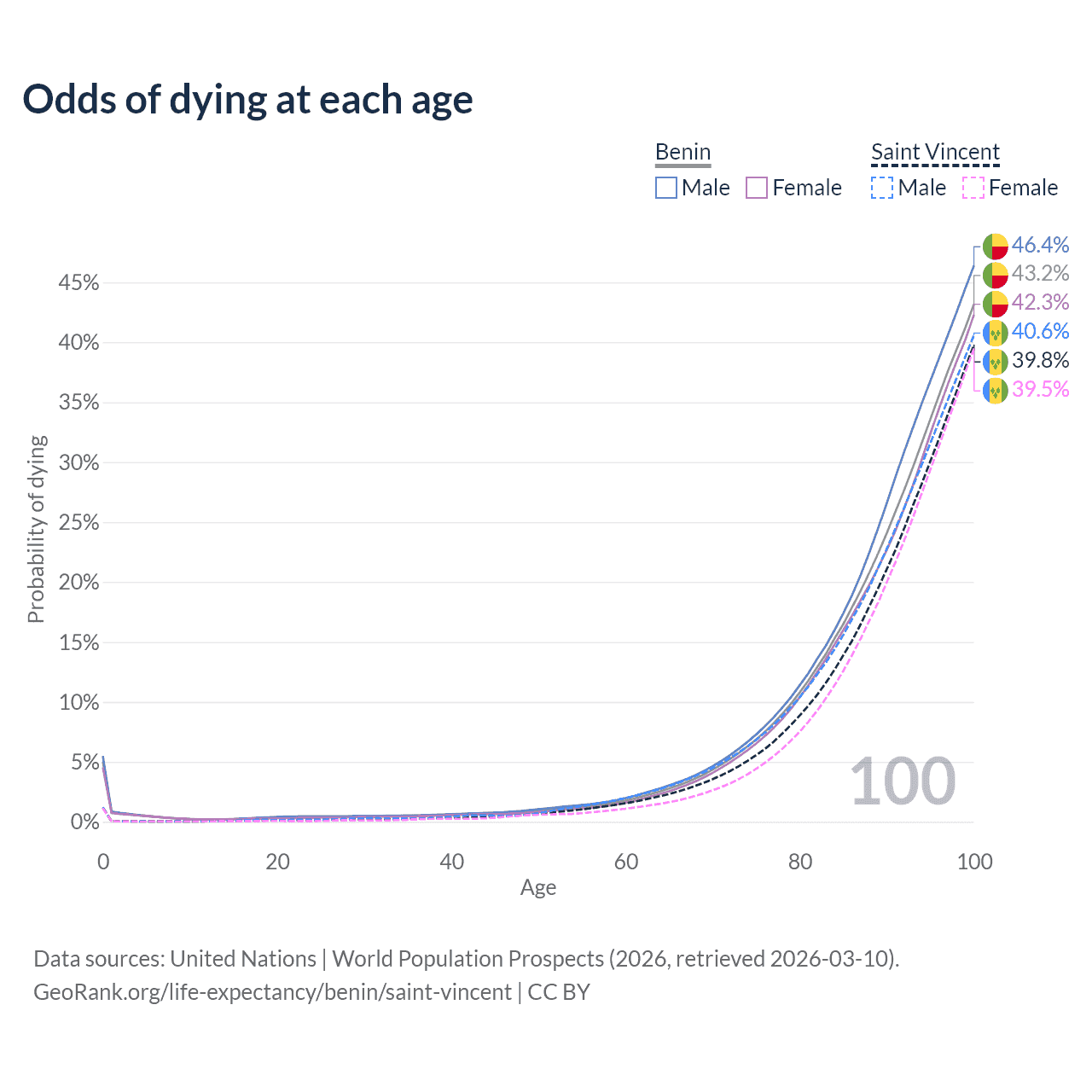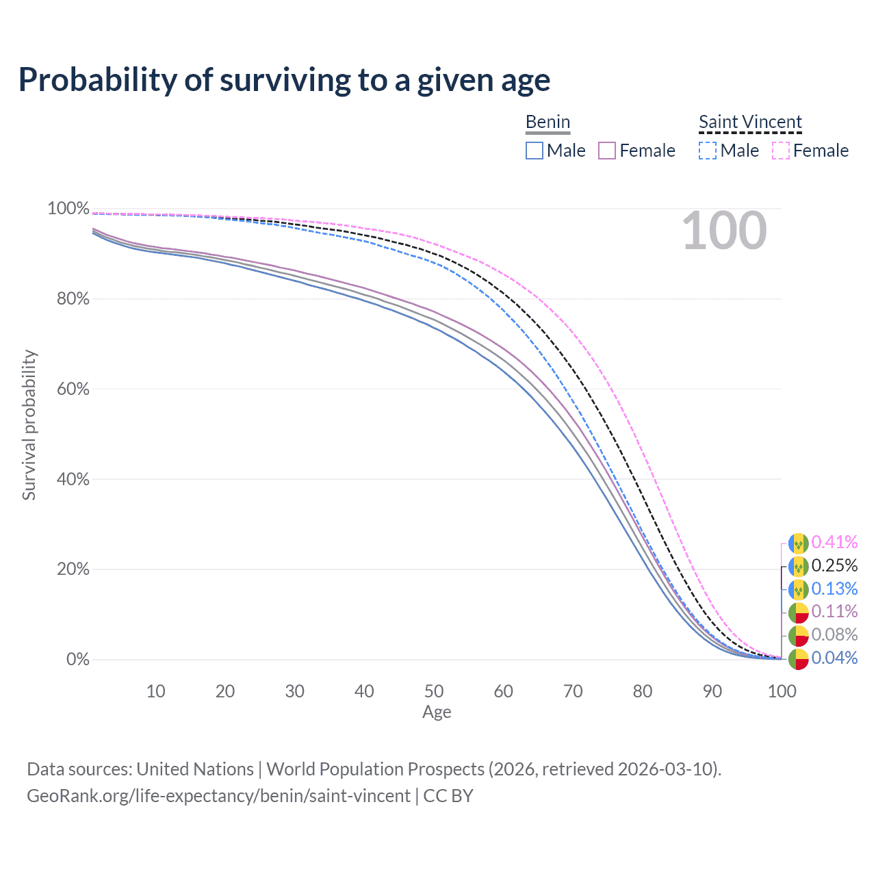 This life expectancy calculator shows the odds of living to 100, 95, 90, and below based on current age for both males and females in Benin and Saint Vincent, along with mean and median age of death. The calculations are based on the 2026 life tables (actuarial tables) from the UN World Population Prospects.