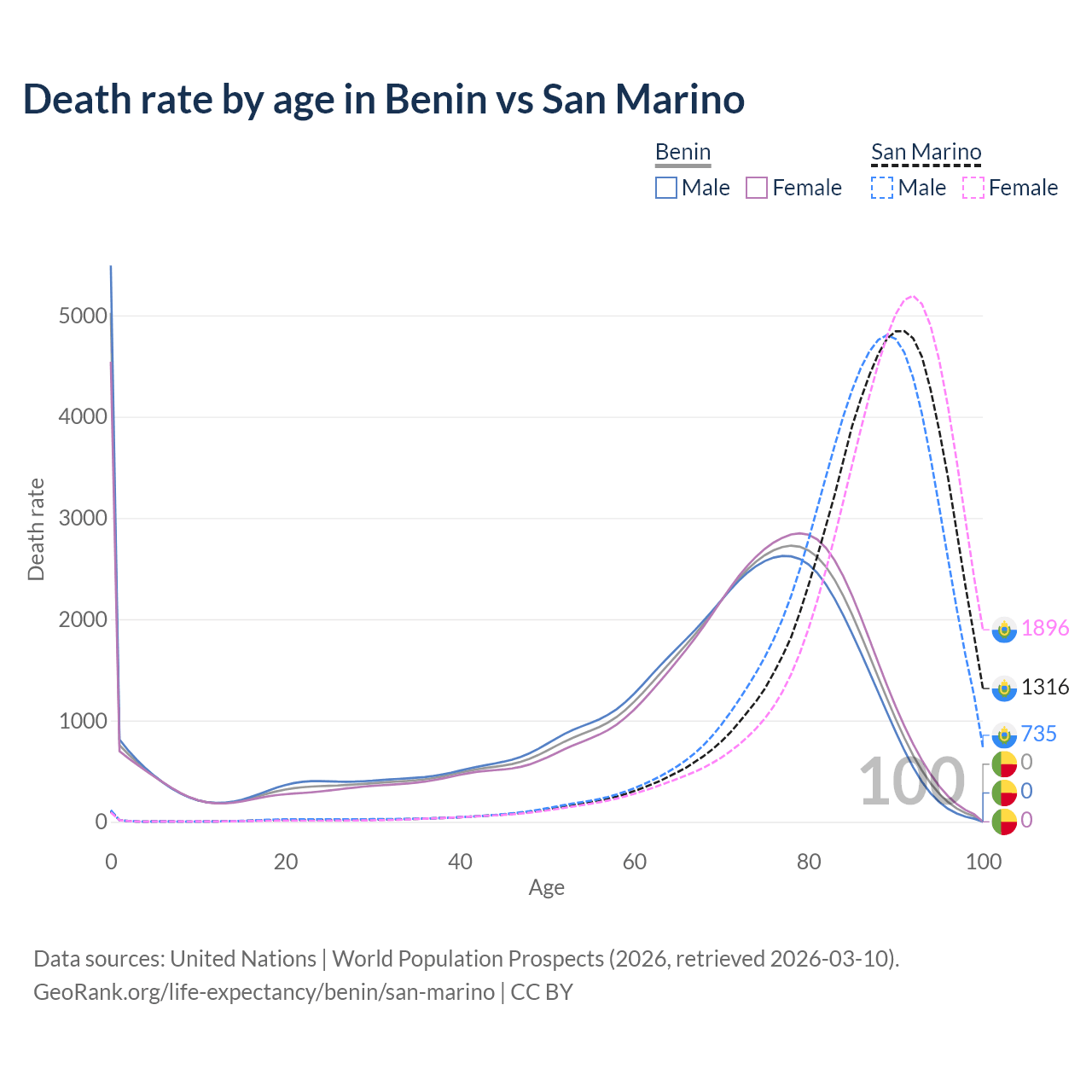 In Benin, the most common age of death is 0, compared to 91 in San Marino. The median age of death is 70.1 in Benin and 88.3 in San Marino, meaning only half of each cohort is expected to live past that age.