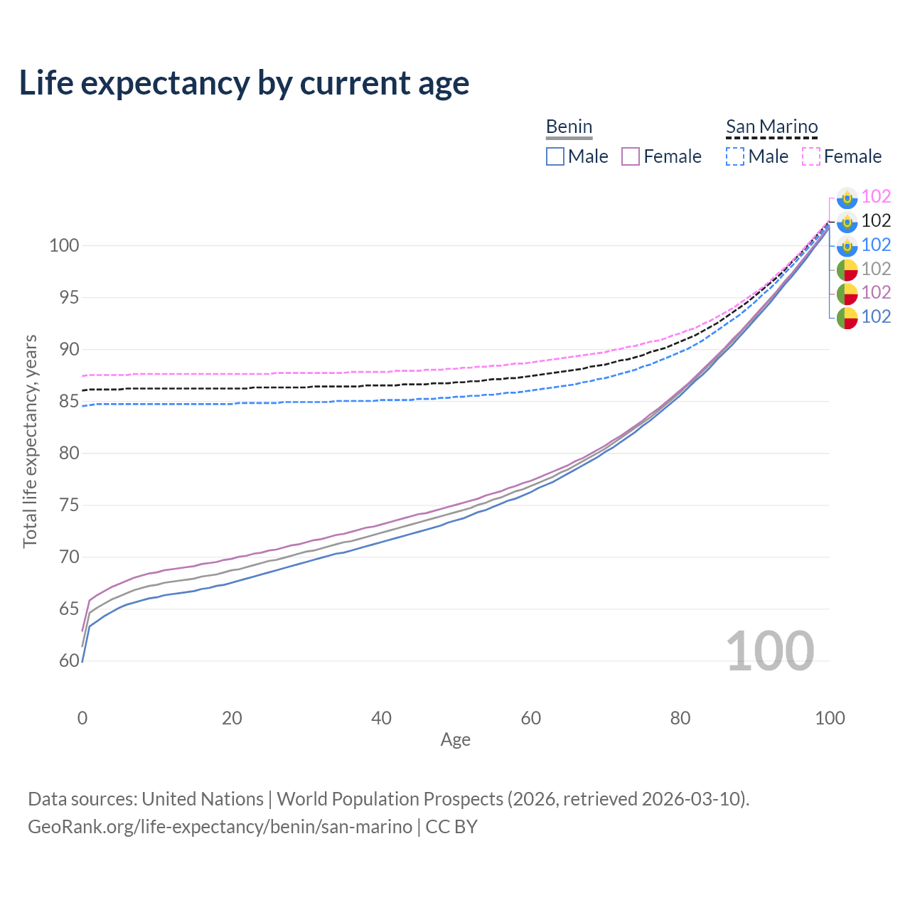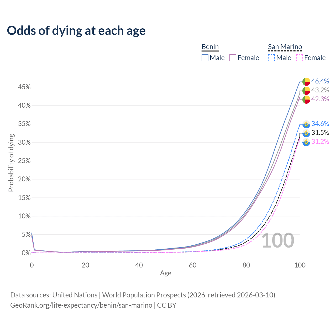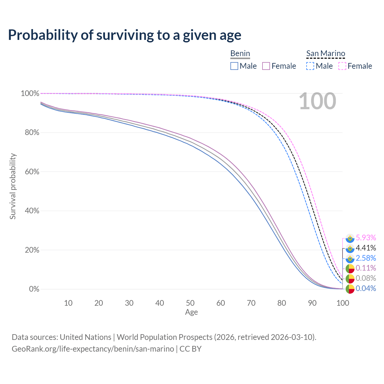 This life expectancy calculator shows the odds of living to 100, 95, 90, and below based on current age for both males and females in Benin and San Marino, along with mean and median age of death. The calculations are based on the 2026 life tables (actuarial tables) from the UN World Population Prospects.