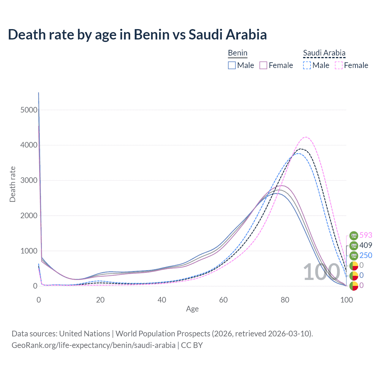 In Benin, the most common age of death is 0, compared to 85 in Saudi Arabia. The median age of death is 70.1 in Benin and 82.5 in Saudi Arabia, meaning only half of each cohort is expected to live past that age.