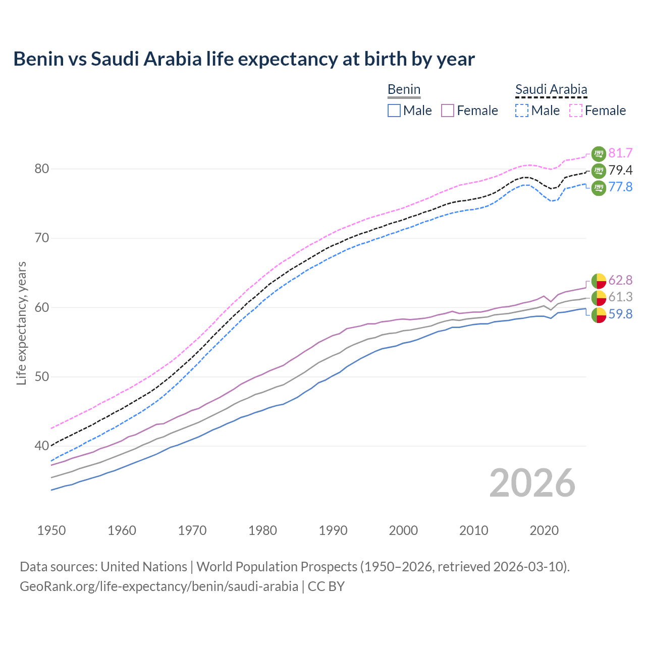 The average life expectancy at birth is 61.3 years in Benin vs 79.4 in Saudi Arabia. Benin is ranked 189/197 by life expectancy, and Saudi Arabia is 49/197. In Benin, the life expectancy is 59.8 years for males and 62.8 years for females. In Saudi Arabia, it's 77.8 years for males and 81.7 years for females.