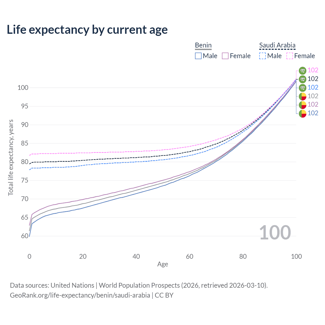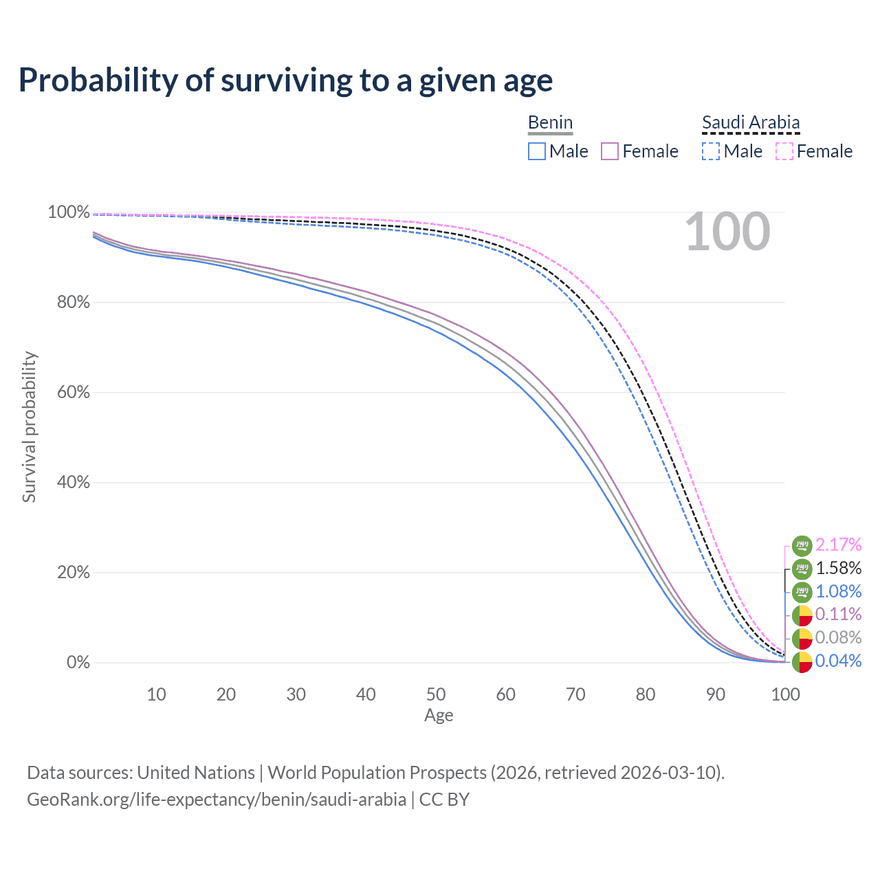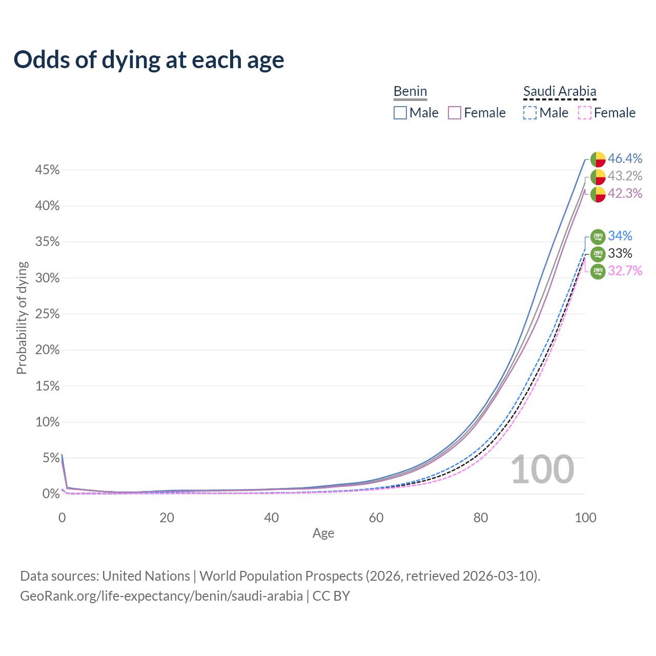 This life expectancy calculator shows the odds of living to 100, 95, 90, and below based on current age for both males and females in Benin and Saudi Arabia, along with mean and median age of death. The calculations are based on the 2026 life tables (actuarial tables) from the UN World Population Prospects.