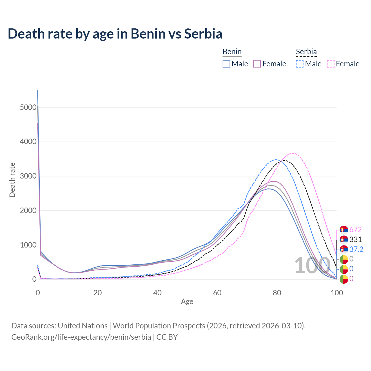 In Benin, the most common age of death is 0, compared to 83 in Serbia. The median age of death is 70.1 in Benin and 79.6 in Serbia, meaning only half of each cohort is expected to live past that age.