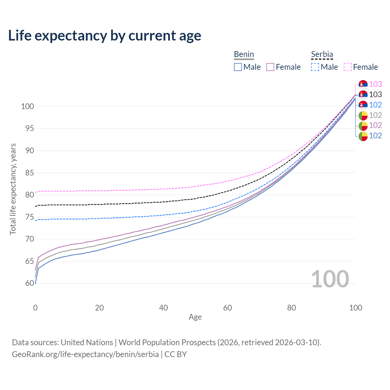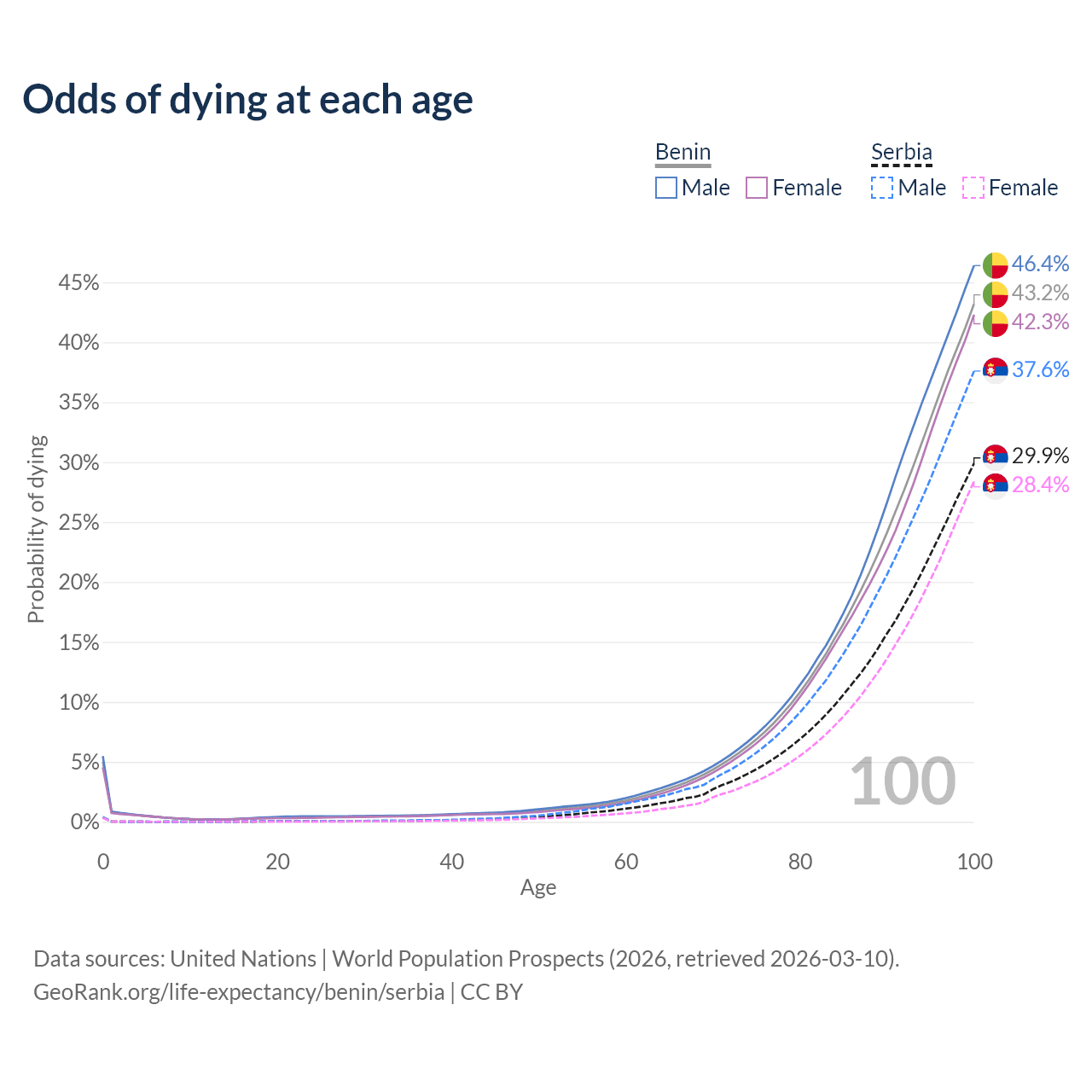 This life expectancy calculator shows the odds of living to 100, 95, 90, and below based on current age for both males and females in Benin and Serbia, along with mean and median age of death. The calculations are based on the 2026 life tables (actuarial tables) from the UN World Population Prospects.