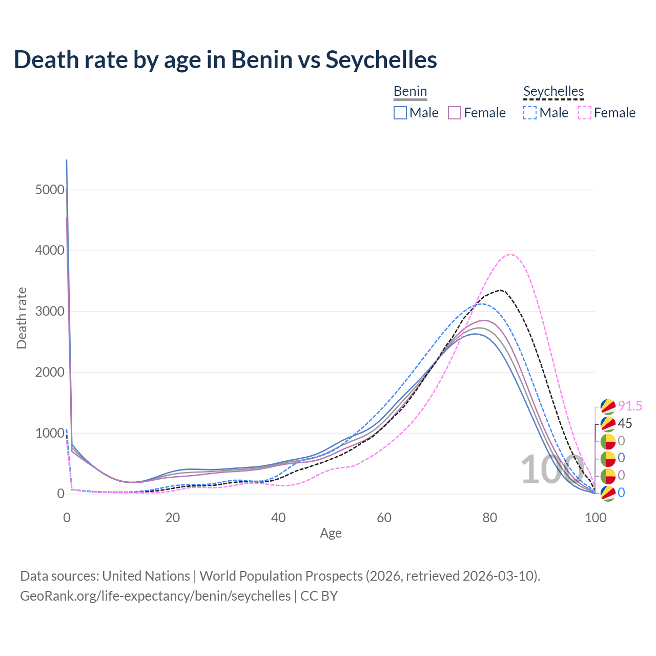 In Benin, the most common age of death is 0, compared to 82 in the Seychelles. The median age of death is 70.1 in Benin and 77 in the Seychelles, meaning only half of each cohort is expected to live past that age.
