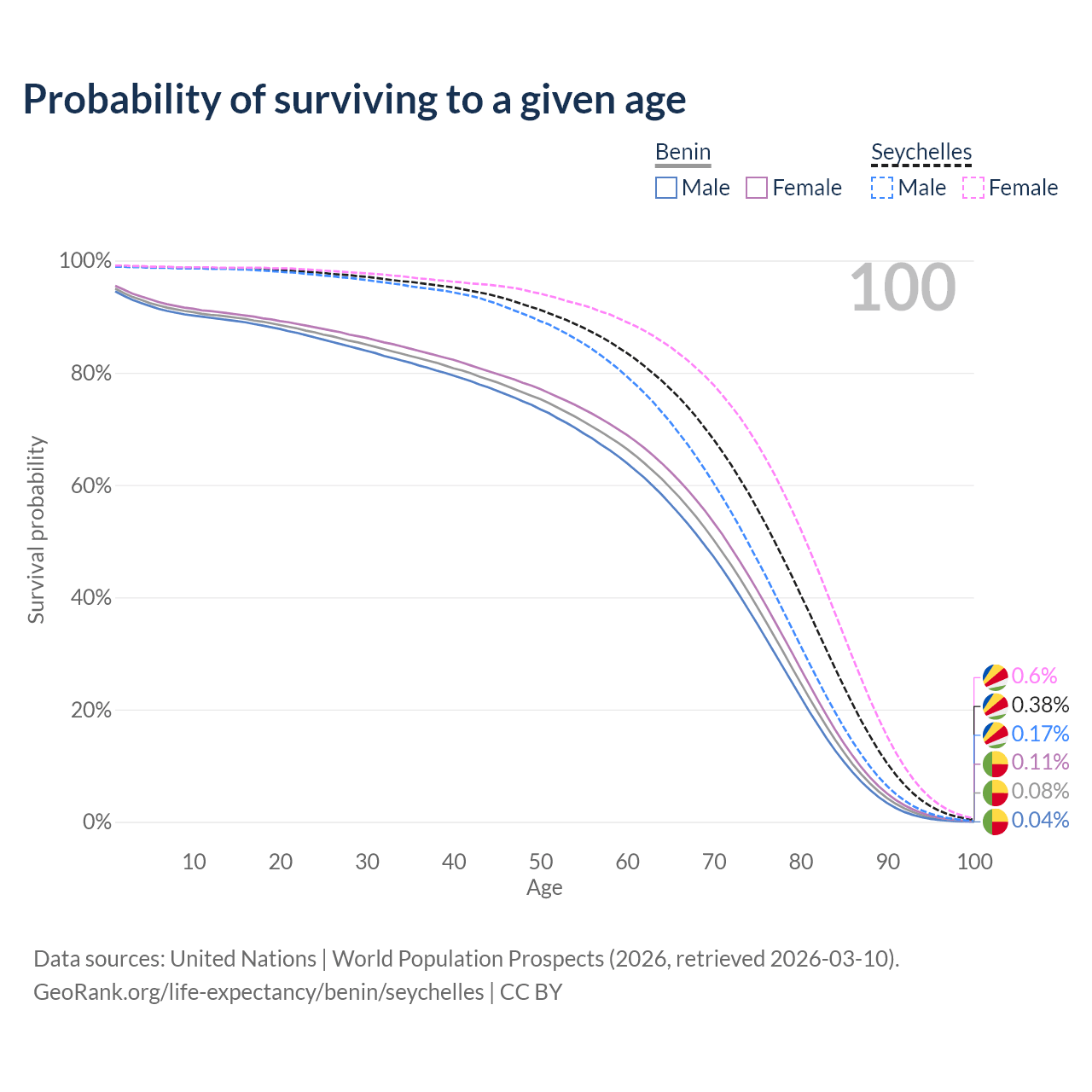 This life expectancy calculator shows the odds of living to 100, 95, 90, and below based on current age for both males and females in Benin and the Seychelles, along with mean and median age of death. The calculations are based on the 2026 life tables (actuarial tables) from the UN World Population Prospects.