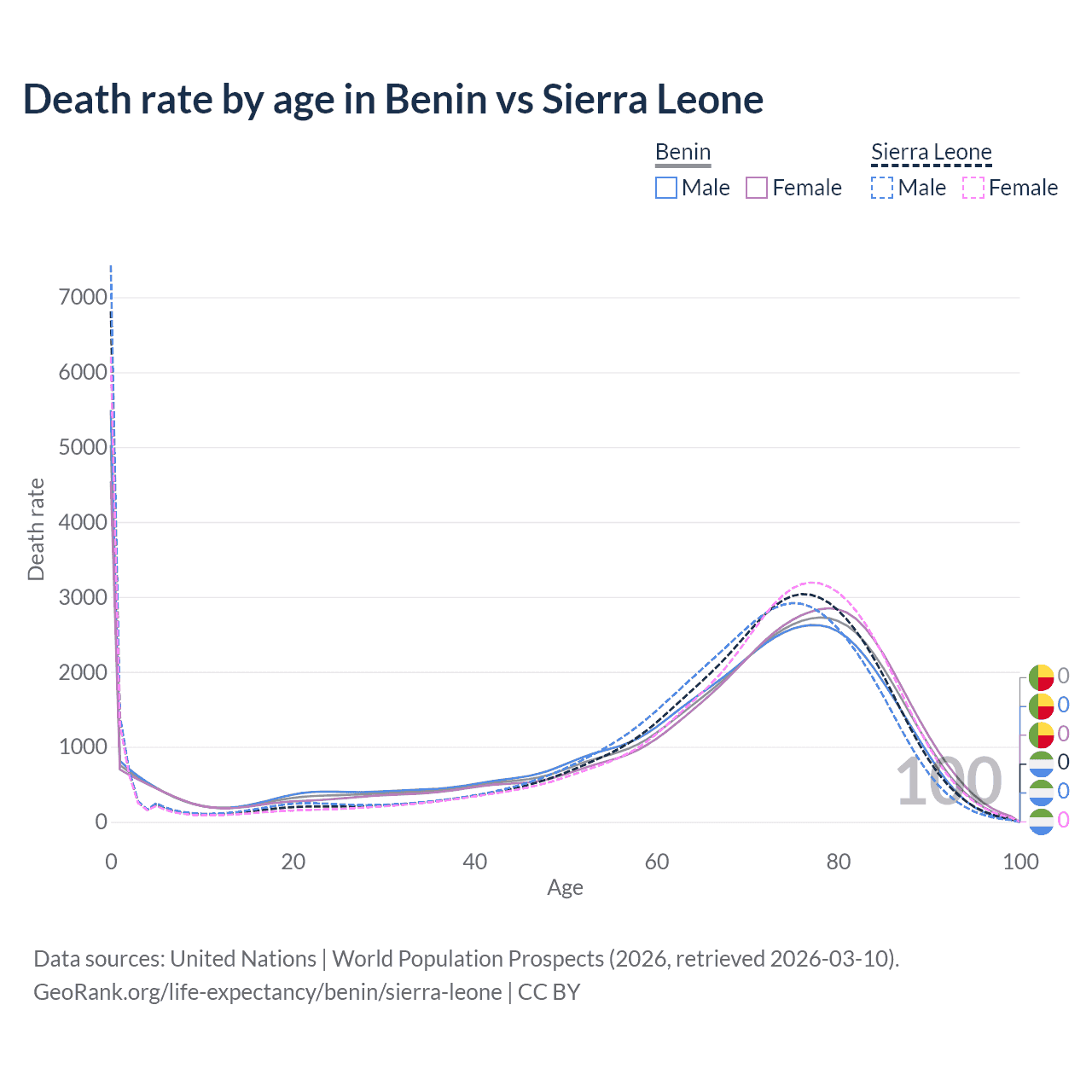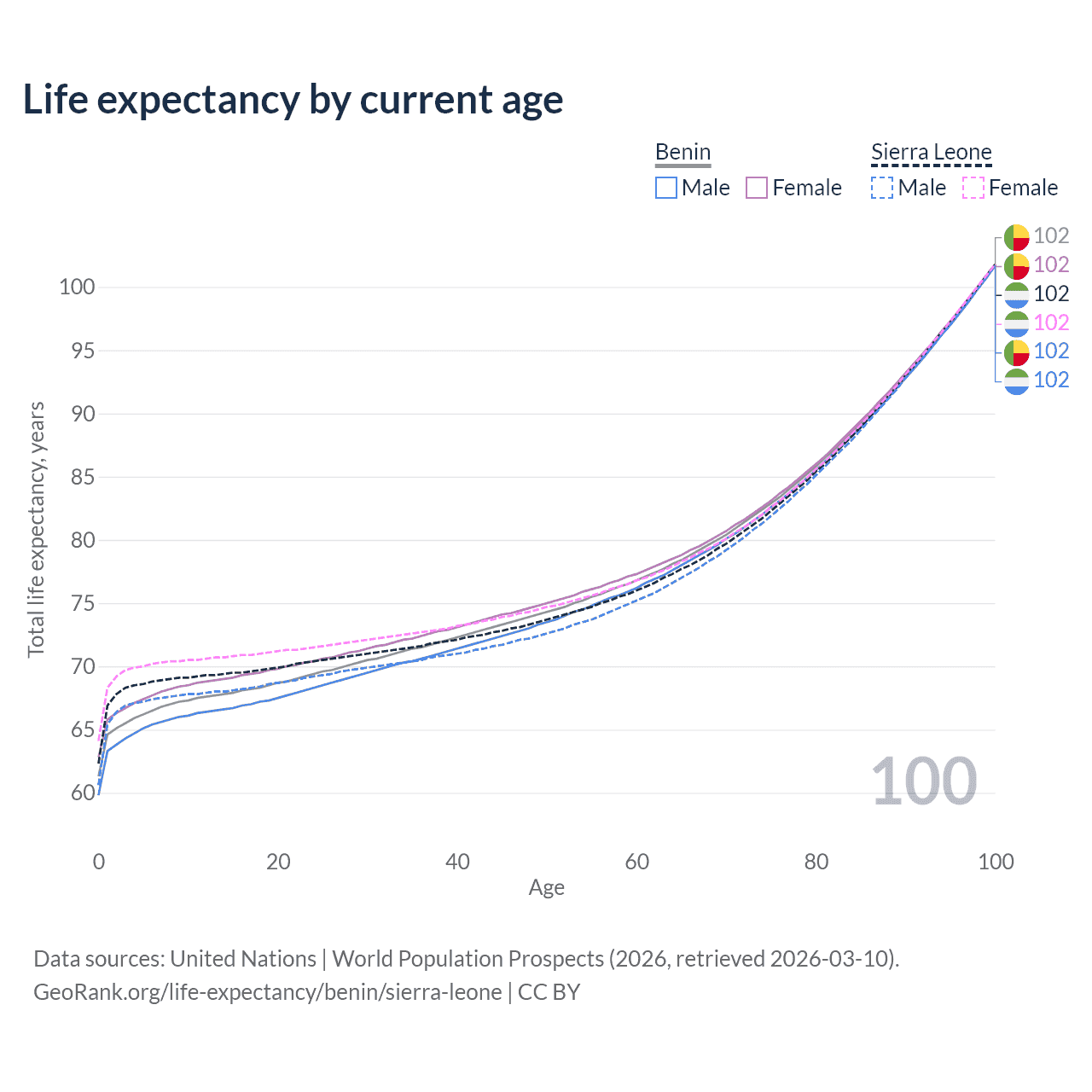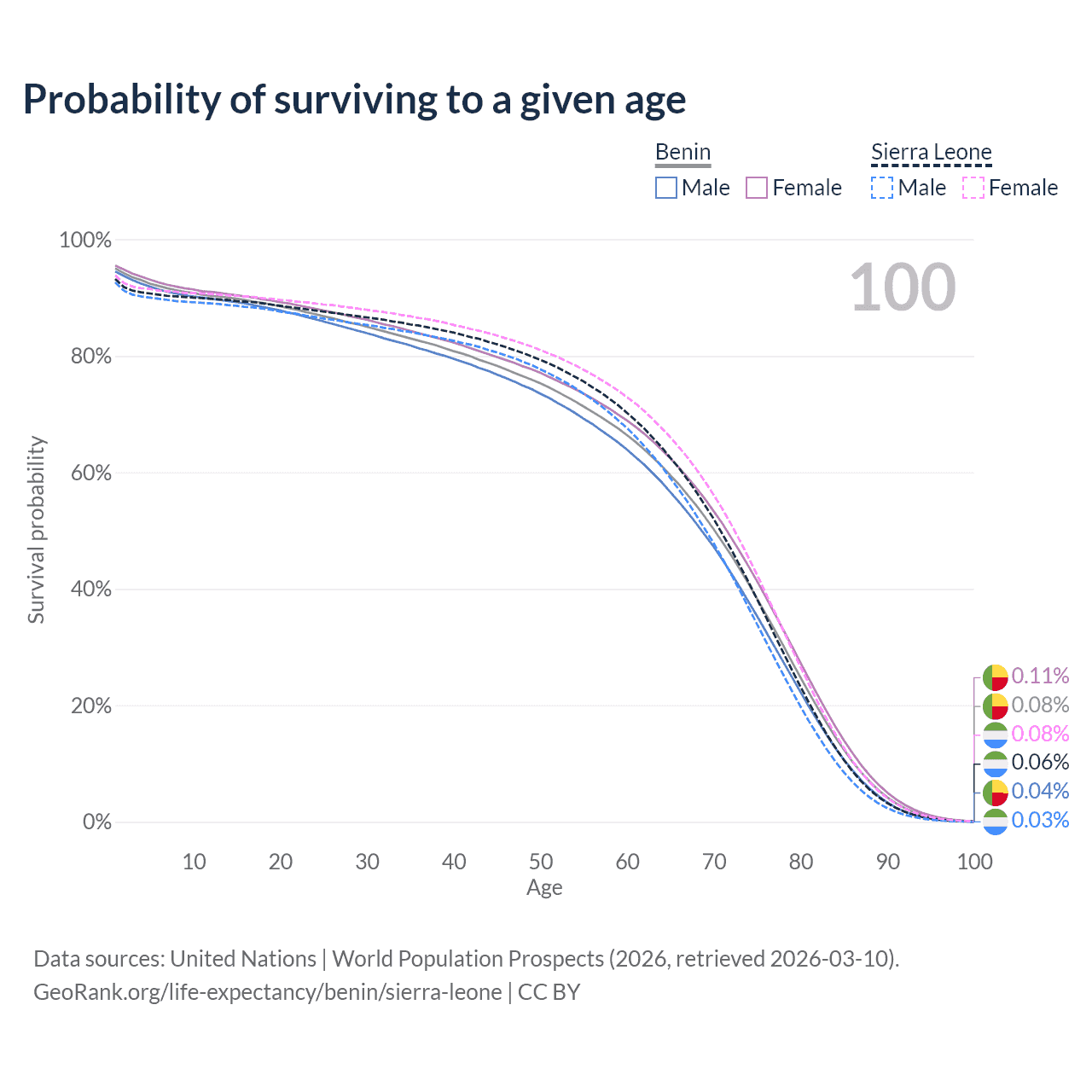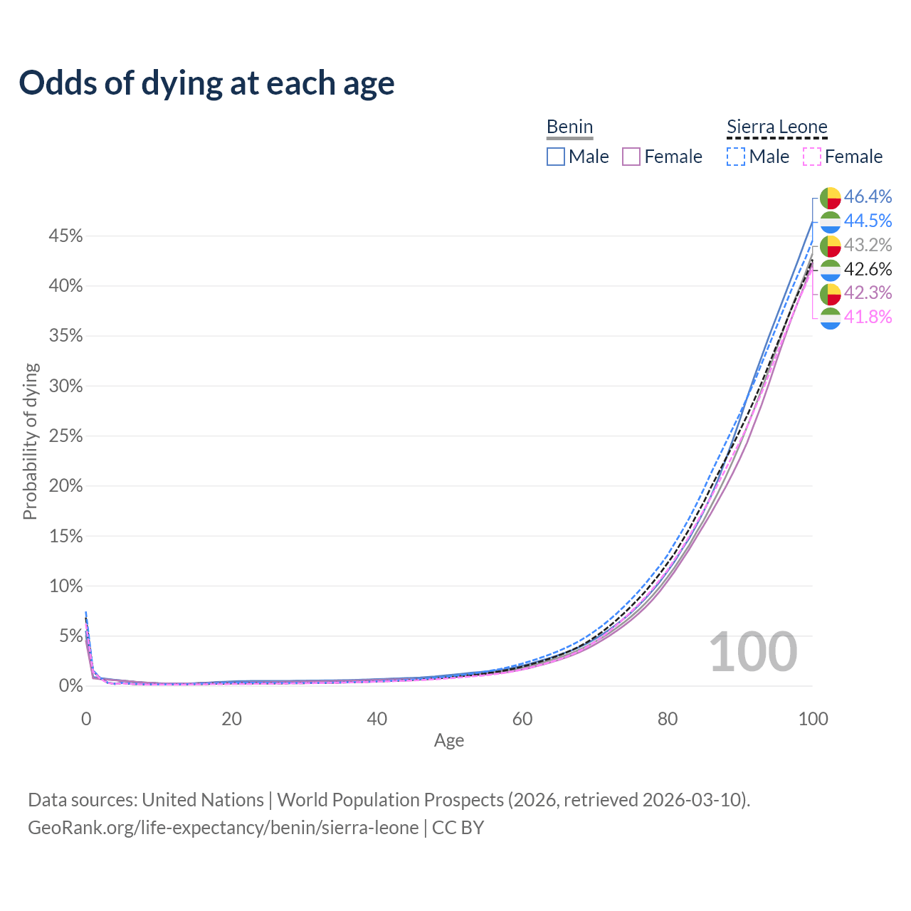 This life expectancy calculator shows the odds of living to 100, 95, 90, and below based on current age for both males and females in Benin and Sierra Leone, along with mean and median age of death. The calculations are based on the 2026 life tables (actuarial tables) from the UN World Population Prospects.