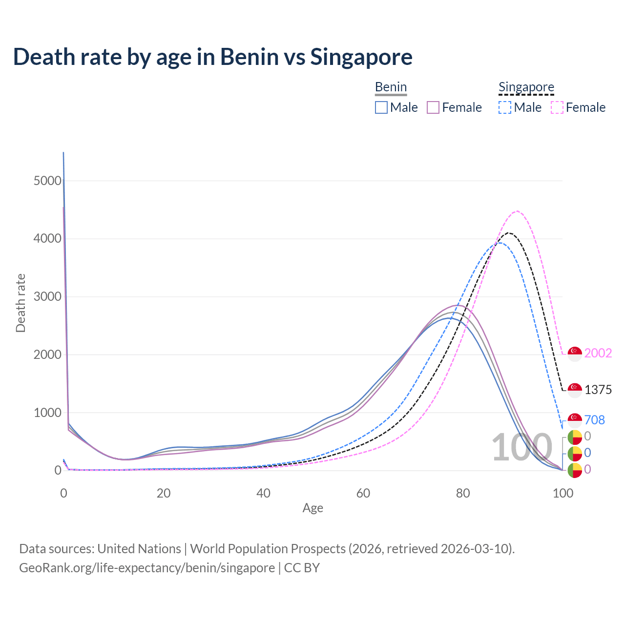 In Benin, the most common age of death is 0, compared to 89 in Singapore. The median age of death is 70.1 in Benin and 86.5 in Singapore, meaning only half of each cohort is expected to live past that age.