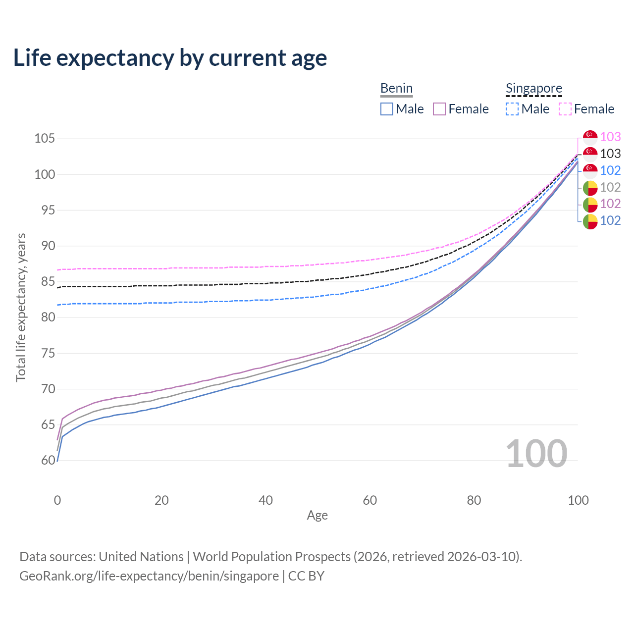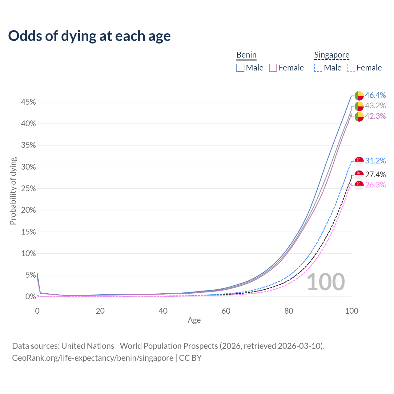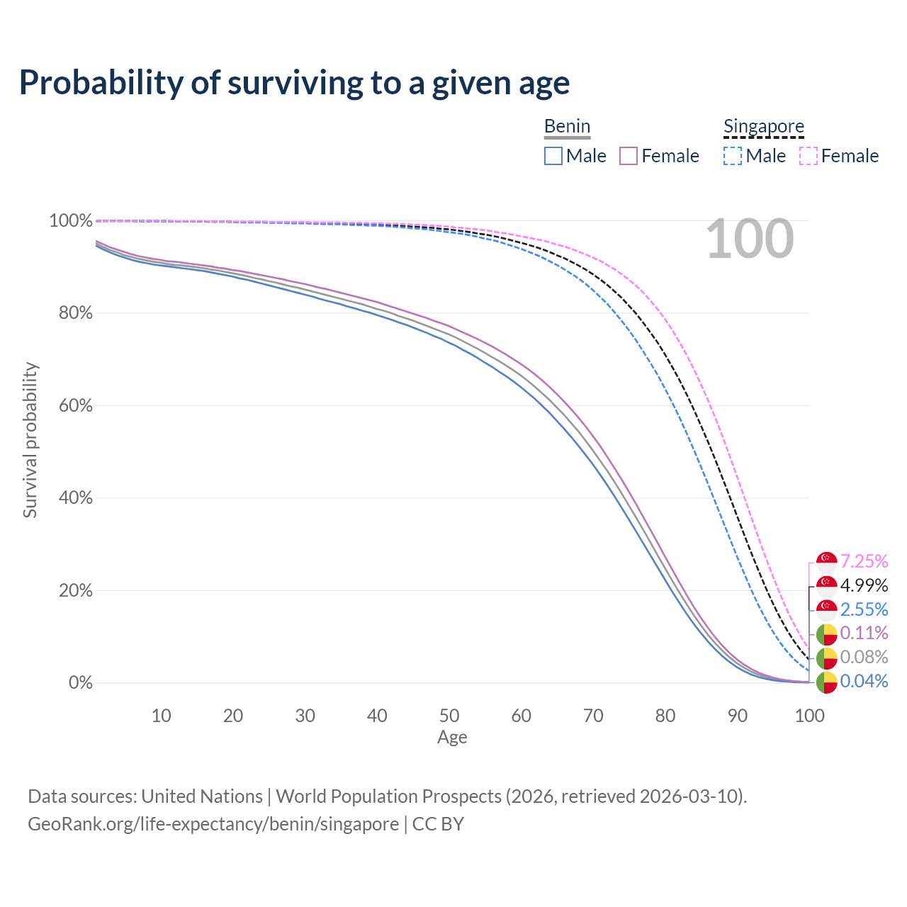 This life expectancy calculator shows the odds of living to 100, 95, 90, and below based on current age for both males and females in Benin and Singapore, along with mean and median age of death. The calculations are based on the 2026 life tables (actuarial tables) from the UN World Population Prospects.