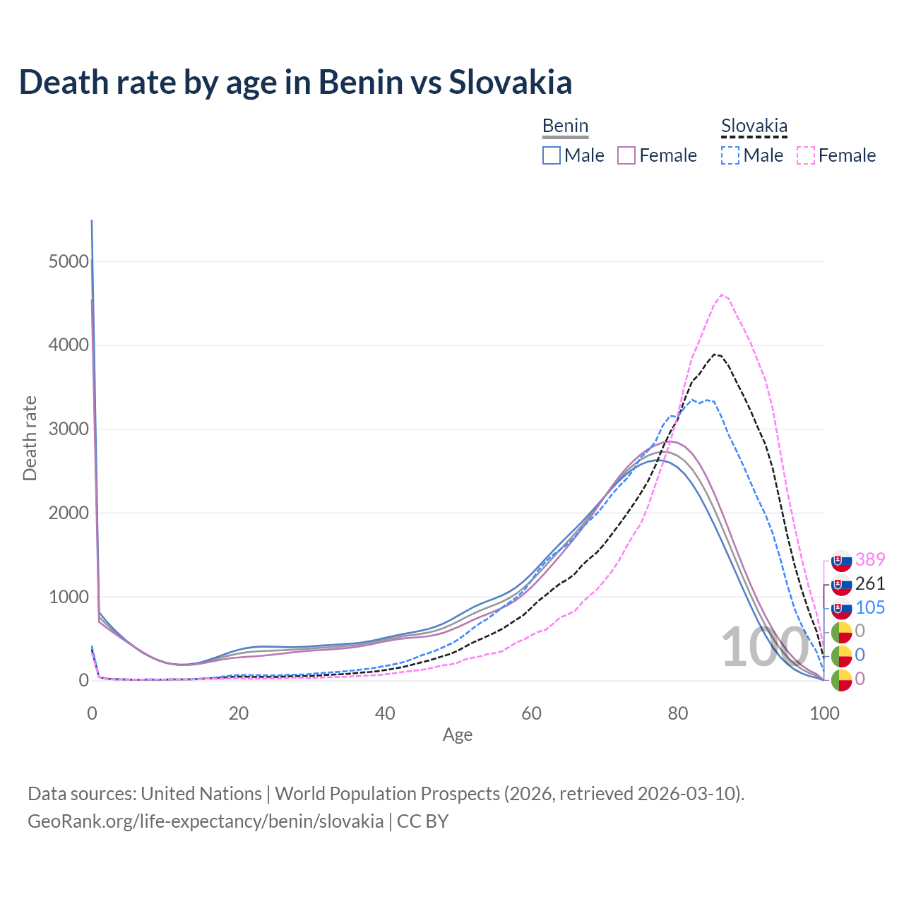 In Benin, the most common age of death is 0, compared to 85 in Slovakia. The median age of death is 70.1 in Benin and 82 in Slovakia, meaning only half of each cohort is expected to live past that age.
