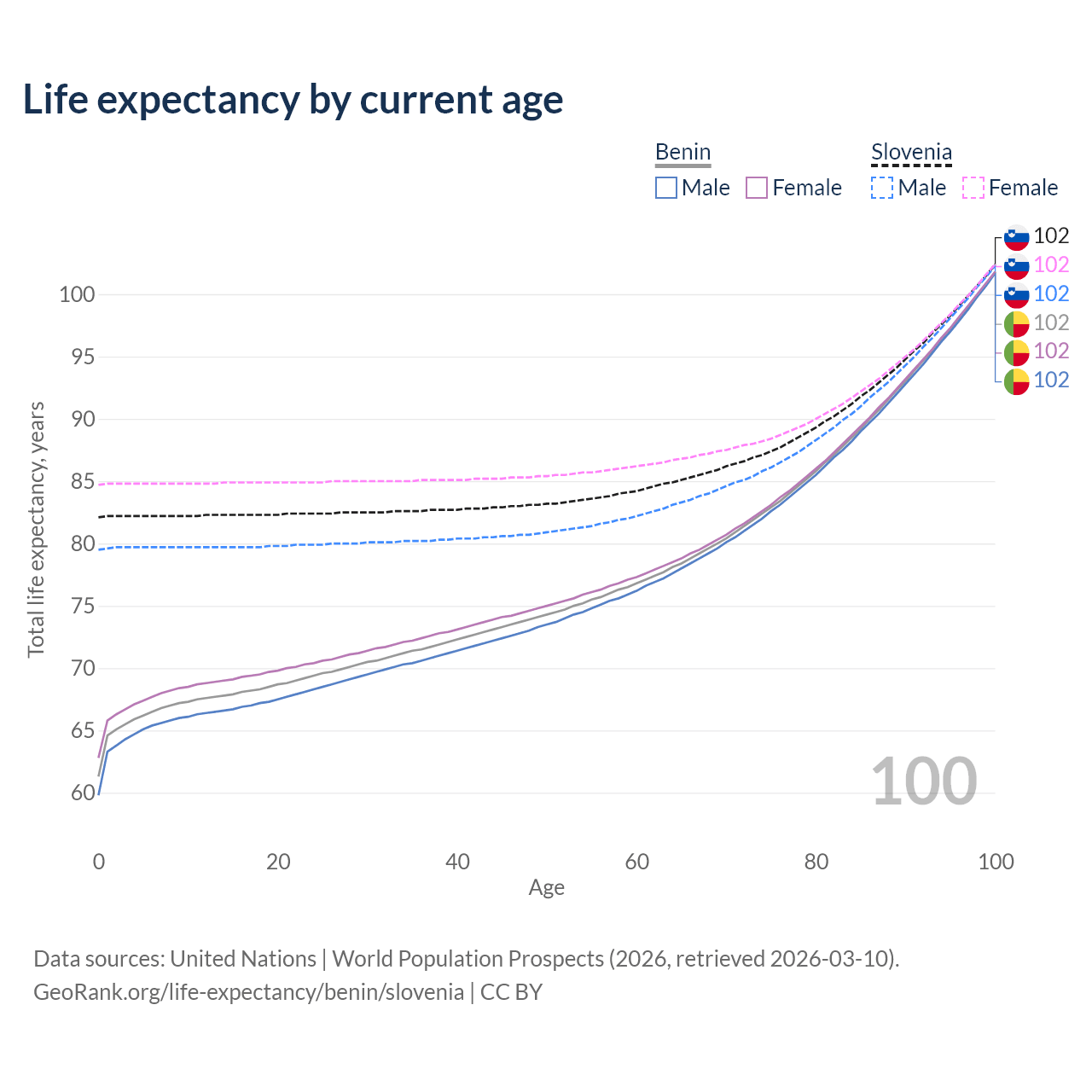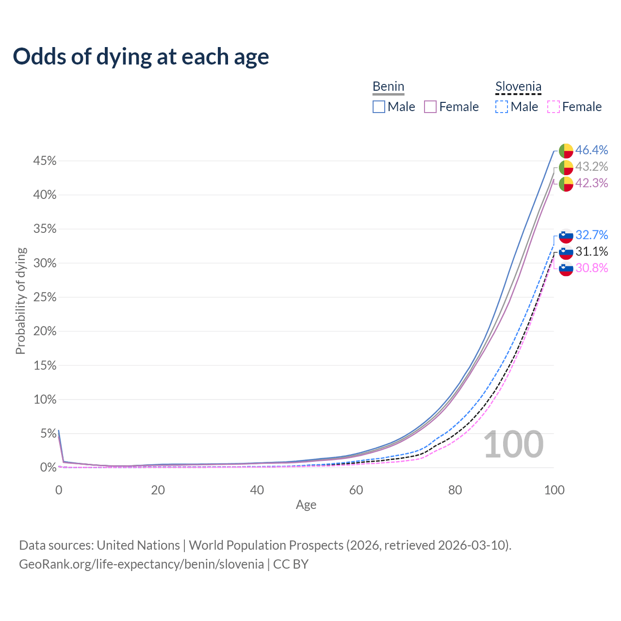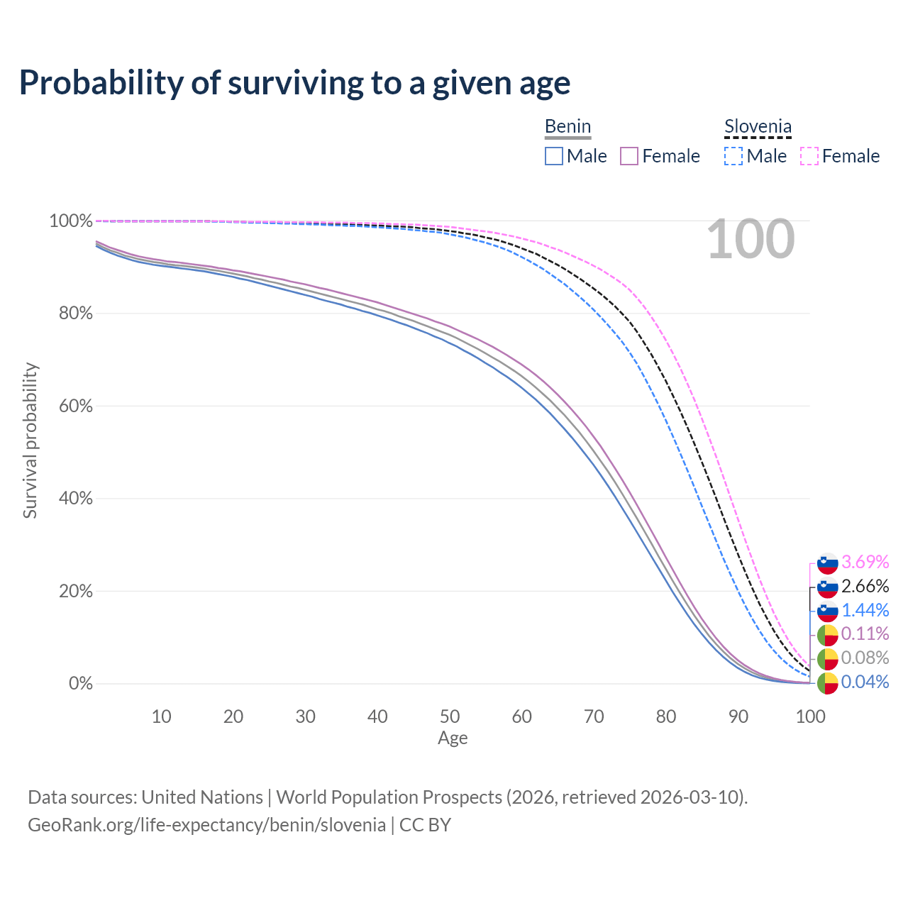 This life expectancy calculator shows the odds of living to 100, 95, 90, and below based on current age for both males and females in Benin and Slovenia, along with mean and median age of death. The calculations are based on the 2026 life tables (actuarial tables) from the UN World Population Prospects.