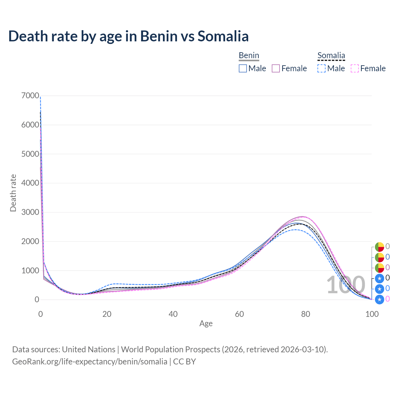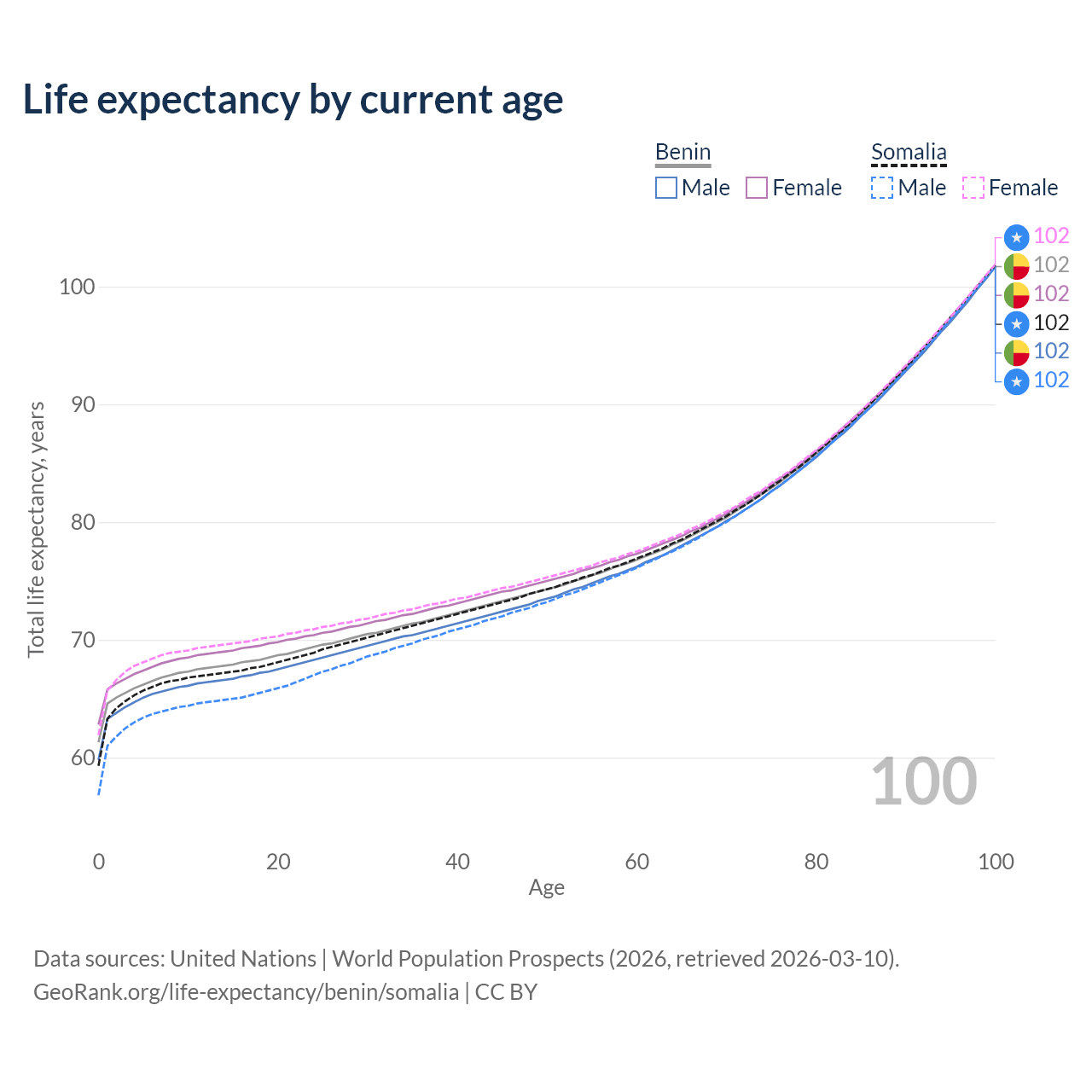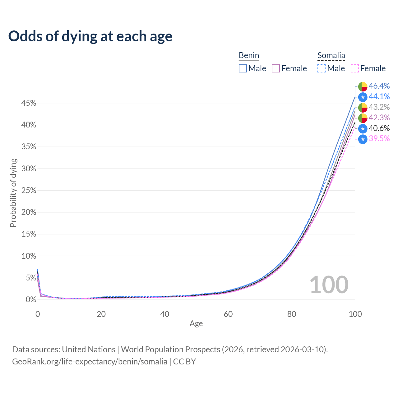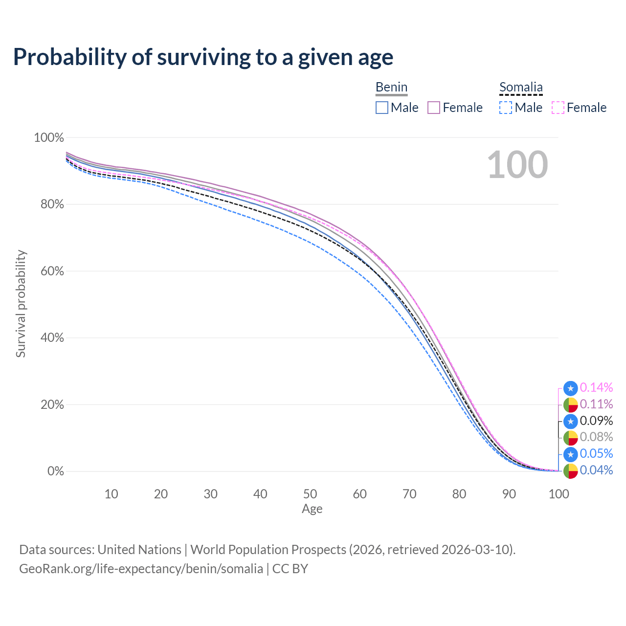 This life expectancy calculator shows the odds of living to 100, 95, 90, and below based on current age for both males and females in Benin and Somalia, along with mean and median age of death. The calculations are based on the 2026 life tables (actuarial tables) from the UN World Population Prospects.