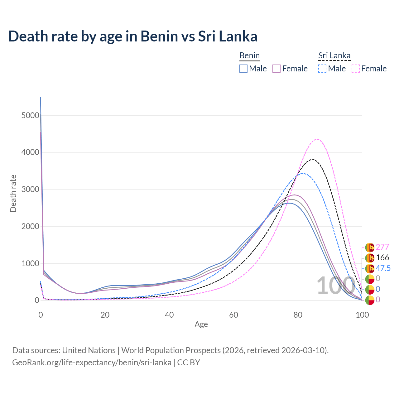In Benin, the most common age of death is 0, compared to 85 in Sri Lanka. The median age of death is 70.1 in Benin and 81 in Sri Lanka, meaning only half of each cohort is expected to live past that age.