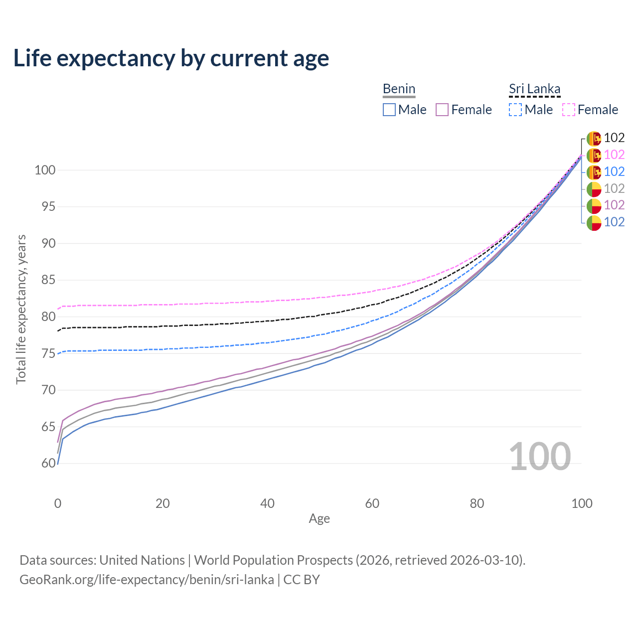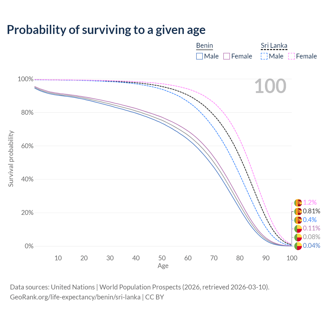 This life expectancy calculator shows the odds of living to 100, 95, 90, and below based on current age for both males and females in Benin and Sri Lanka, along with mean and median age of death. The calculations are based on the 2026 life tables (actuarial tables) from the UN World Population Prospects.