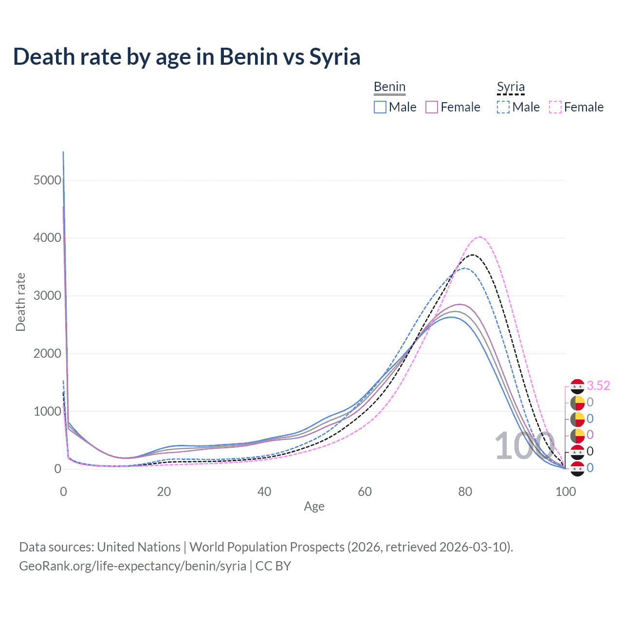 In Benin, the most common age of death is 0, compared to 82 in Syria. The median age of death is 70.1 in Benin and 77.7 in Syria, meaning only half of each cohort is expected to live past that age.