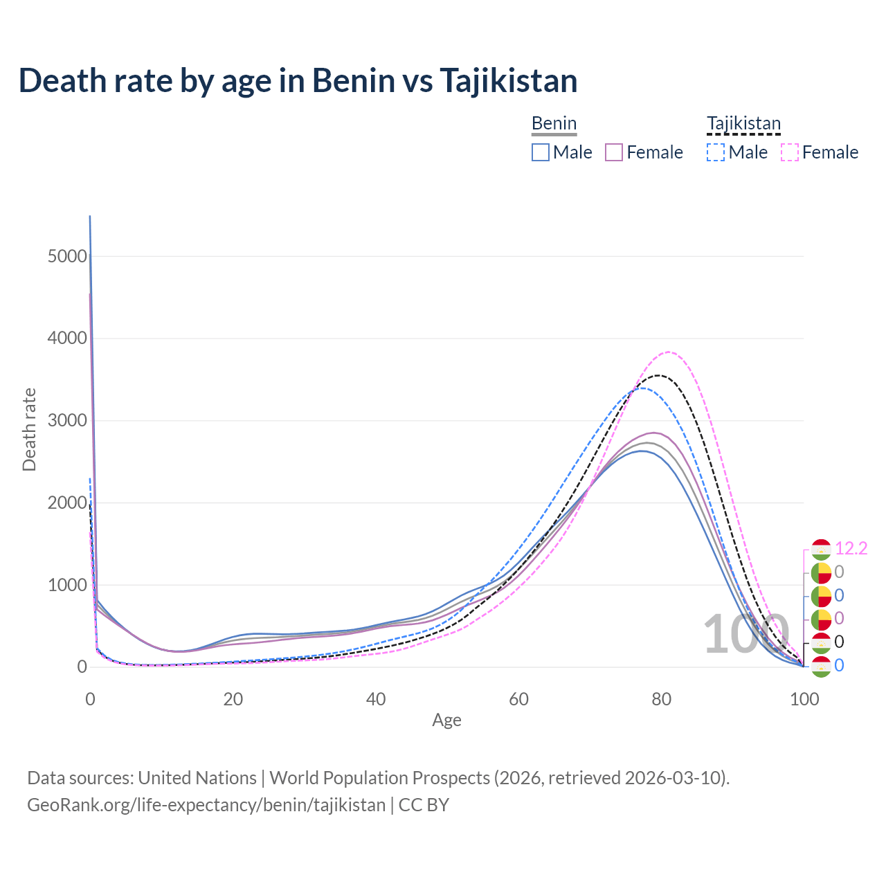 In Benin, the most common age of death is 0, compared to 80 in Tajikistan. The median age of death is 70.1 in Benin and 76 in Tajikistan, meaning only half of each cohort is expected to live past that age.