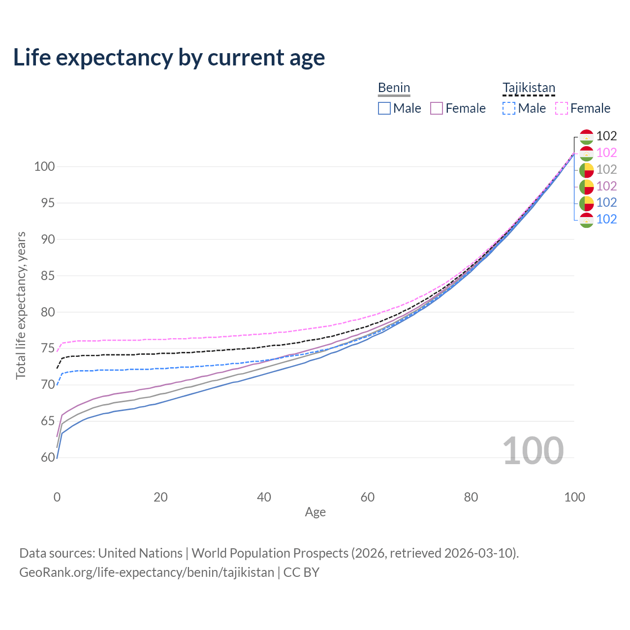 This life expectancy calculator shows the odds of living to 100, 95, 90, and below based on current age for both males and females in Benin and Tajikistan, along with mean and median age of death. The calculations are based on the 2026 life tables (actuarial tables) from the UN World Population Prospects.