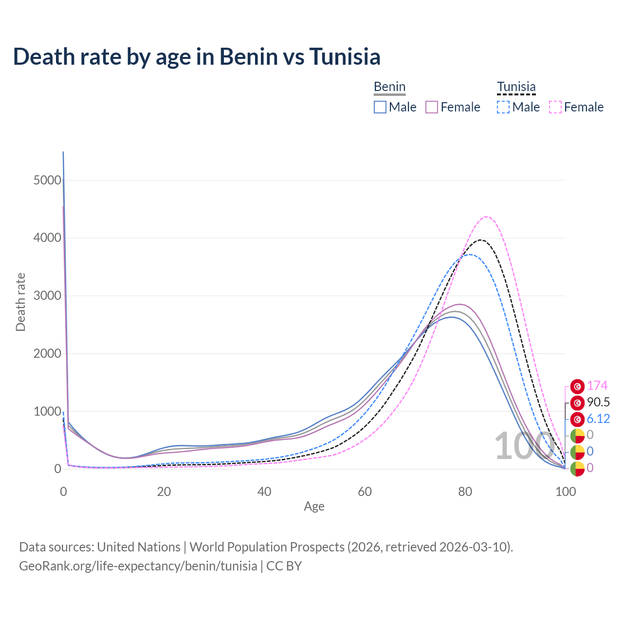 This life expectancy calculator shows the odds of living to 100, 95, 90, and below based on current age for both males and females in Benin and Tunisia, along with mean and median age of death. The calculations are based on the 2026 life tables (actuarial tables) from the UN World Population Prospects.