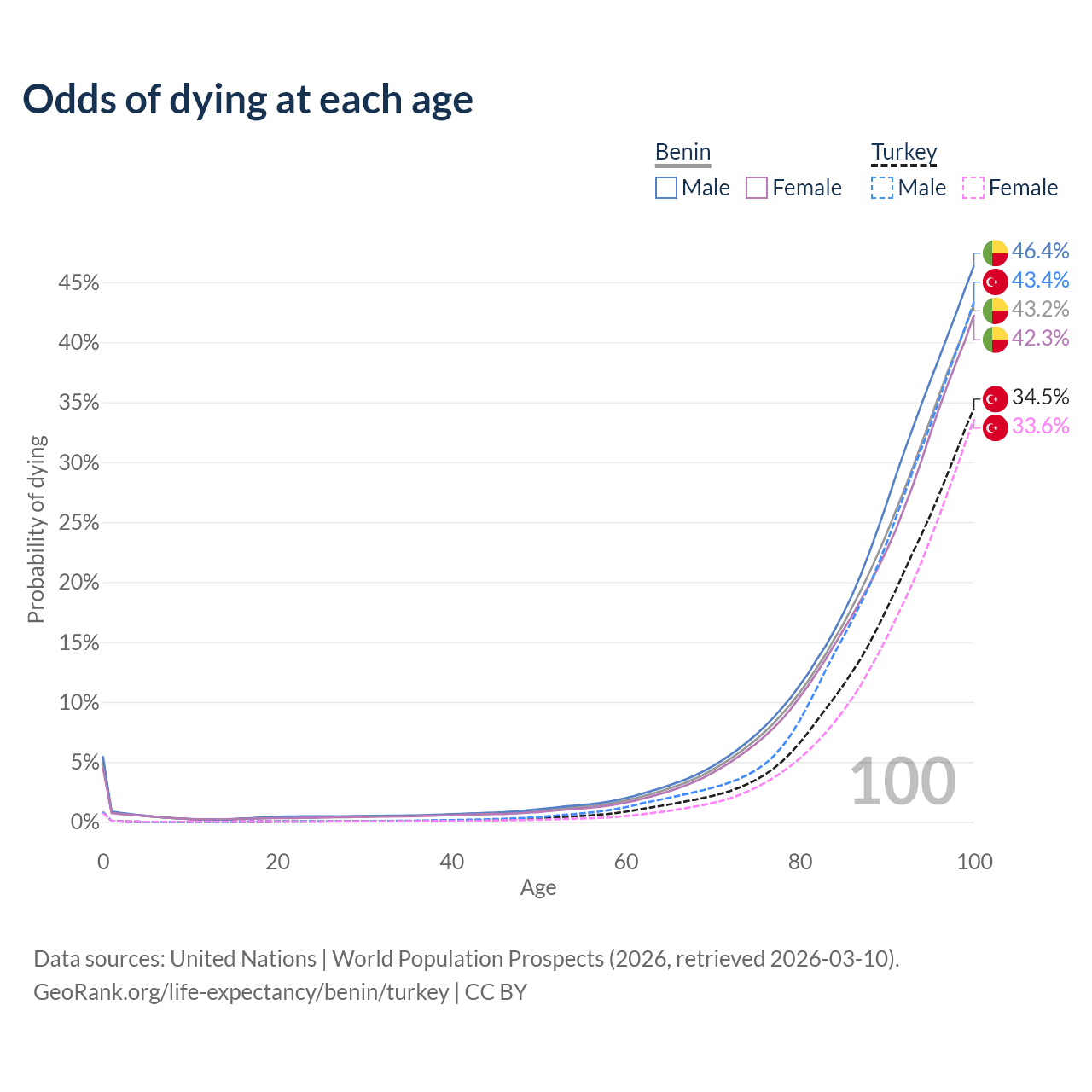 This life expectancy calculator shows the odds of living to 100, 95, 90, and below based on current age for both males and females in Benin and Turkey, along with mean and median age of death. The calculations are based on the 2026 life tables (actuarial tables) from the UN World Population Prospects.