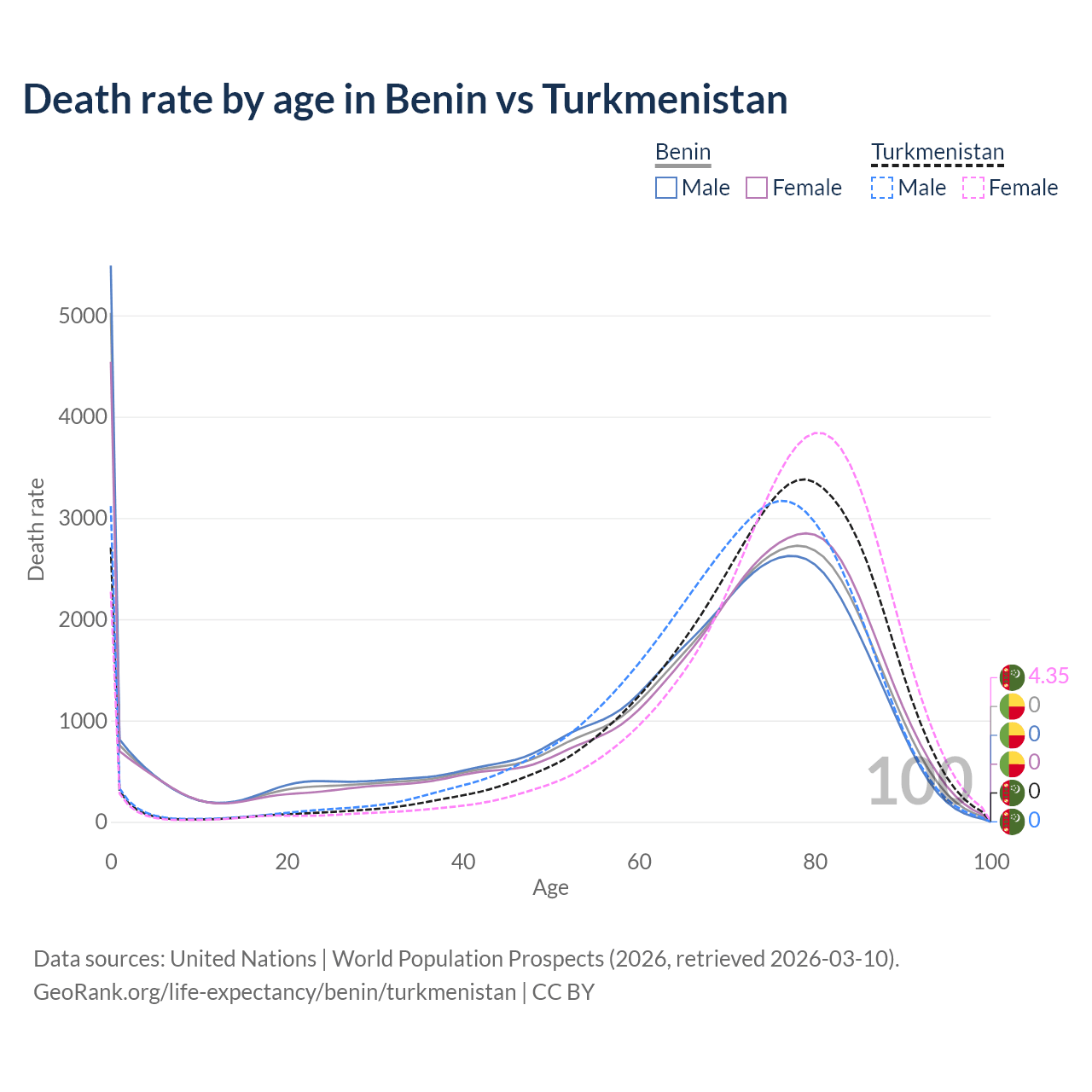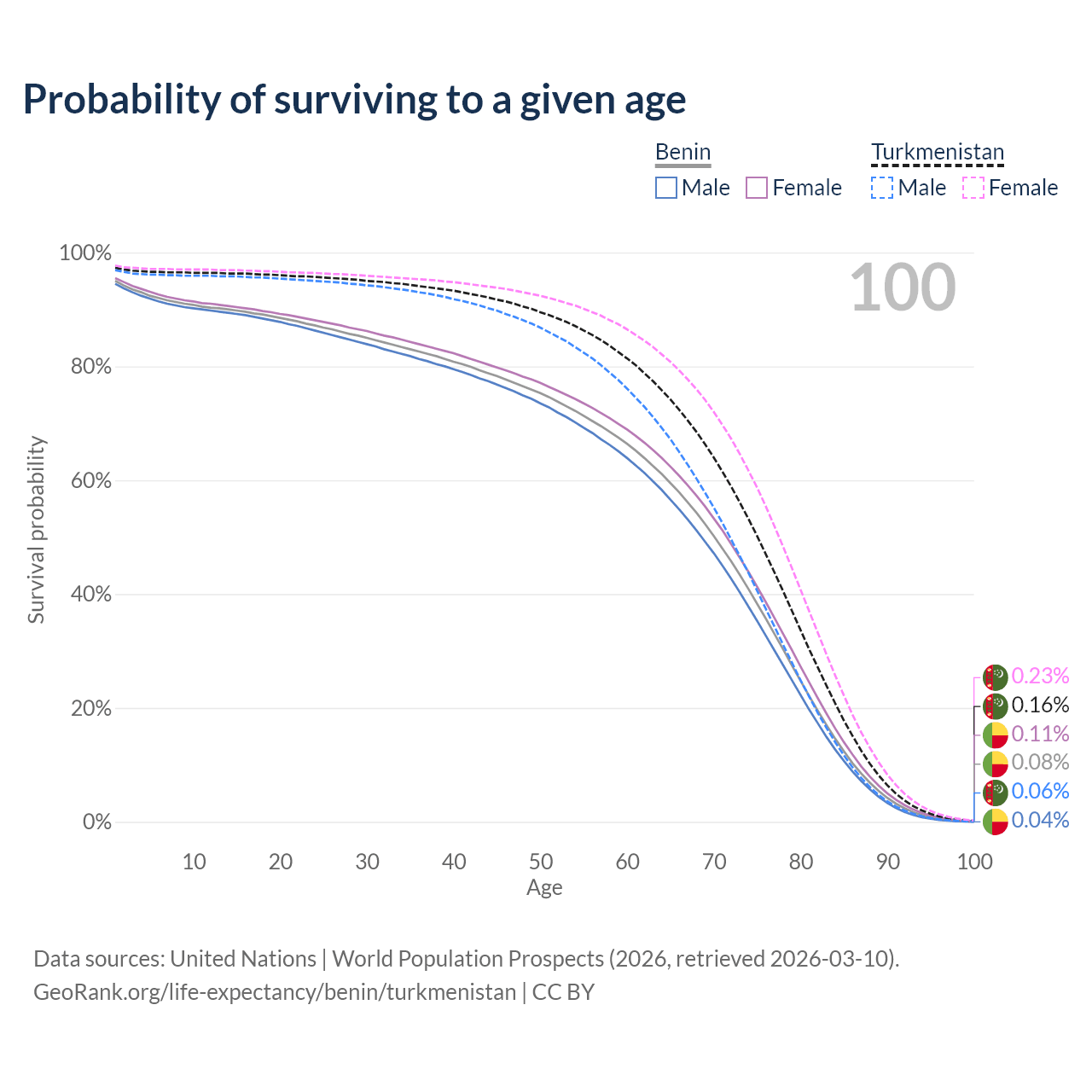 This life expectancy calculator shows the odds of living to 100, 95, 90, and below based on current age for both males and females in Benin and Turkmenistan, along with mean and median age of death. The calculations are based on the 2026 life tables (actuarial tables) from the UN World Population Prospects.