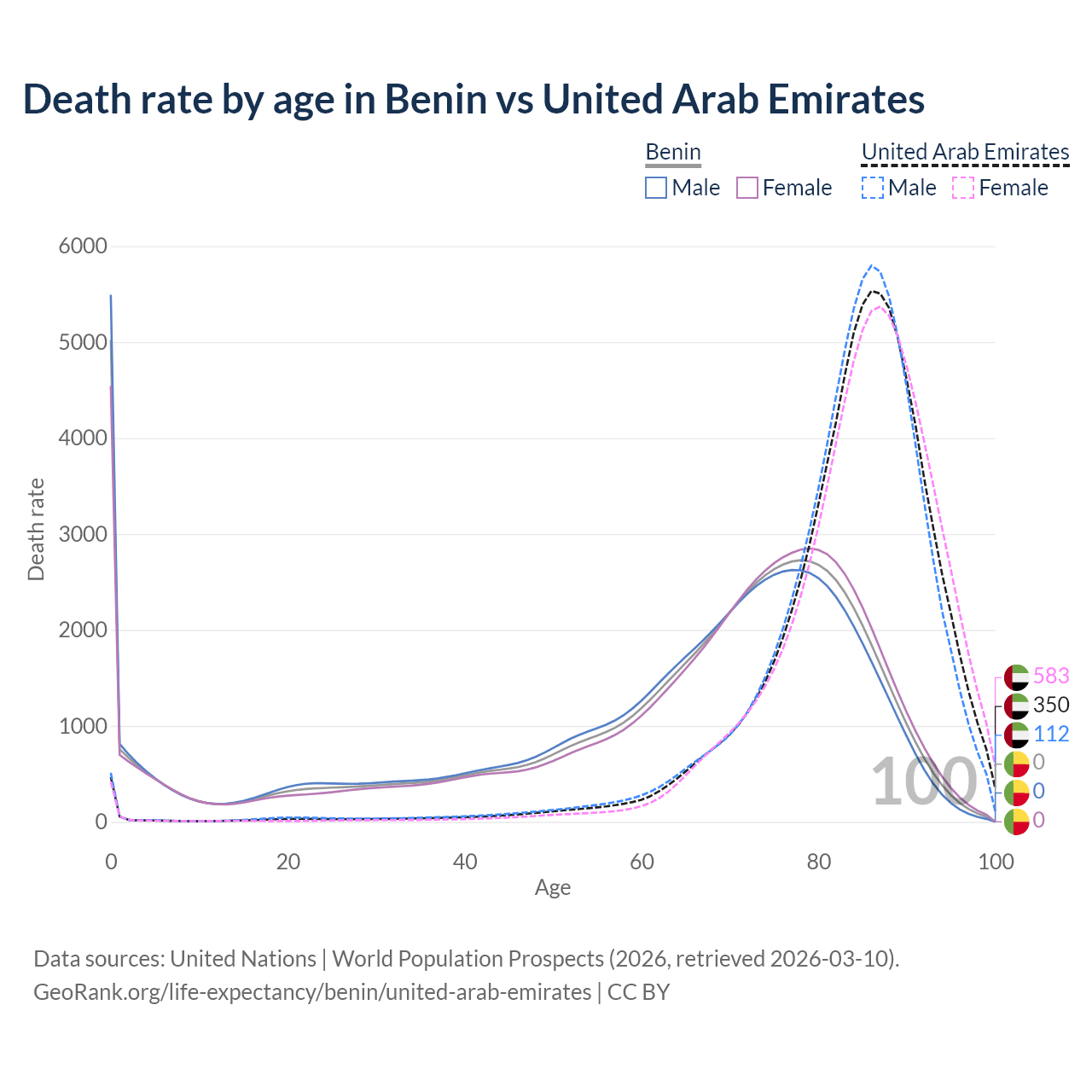 In Benin, the most common age of death is 0, compared to 86 in the United Arab Emirates. The median age of death is 70.1 in Benin and 85.6 in the United Arab Emirates, meaning only half of each cohort is expected to live past that age.